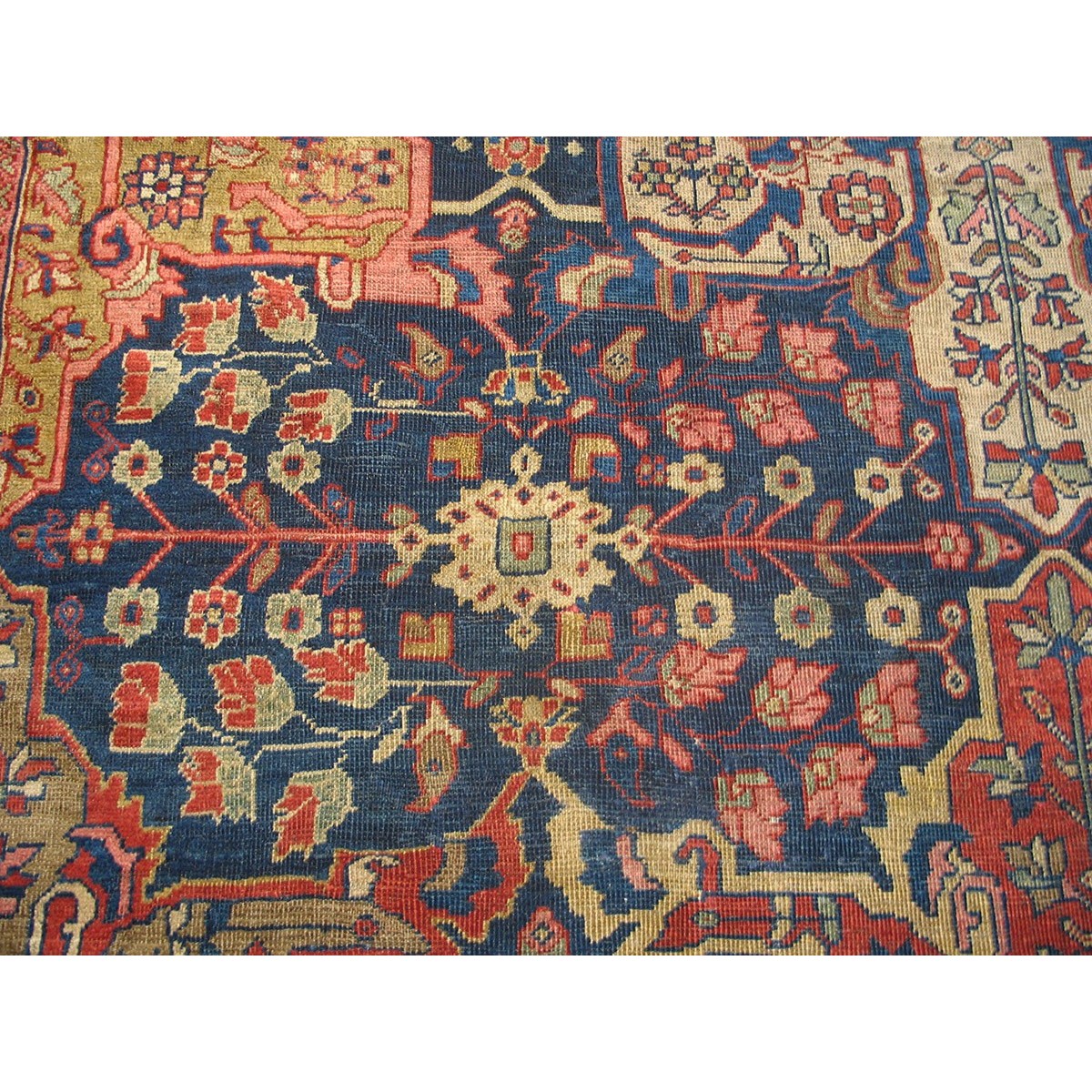 DescriptionSultanabadArak province in western Iran encompasses the town of Sultanabad and various satellite villages, all of which weave for export:the sarouk, Mahal and MushKabad. The latter two grades comprise the sultanabad production. Virtually all are large carpets, up to 16 x 25, with overall, or medallions on decorated or open fields, in soft to bright colors on a cotton foundation, the pile is lowish. The design corpus includes the ever popular Herati, the Harshang palmette motif, rosettes and arabesques, small repeated medallions, etc. The weave varies from coarse to medium. Today, the soft colored pieces with bold patterns are particularly favored. Prices range widely, low for commercial pieces 50 years old, astronomical for light colored Zieglers (see below). | |