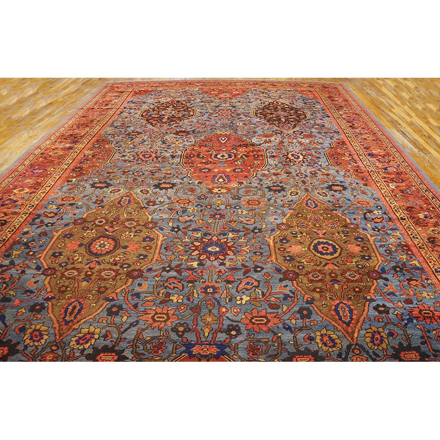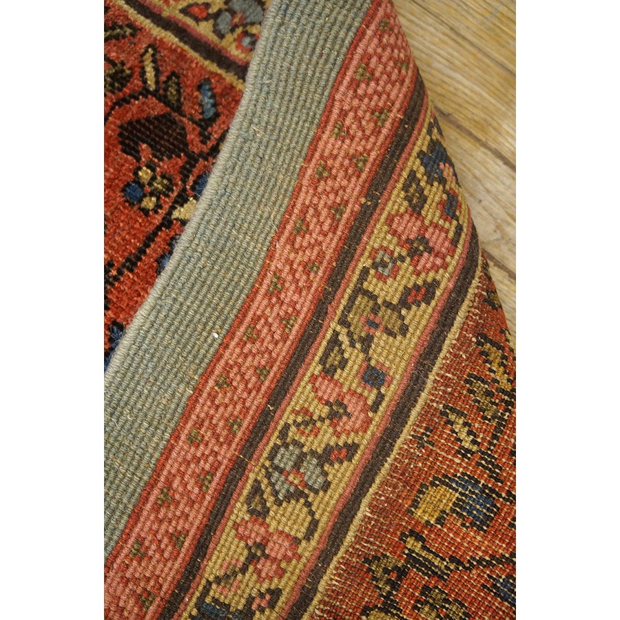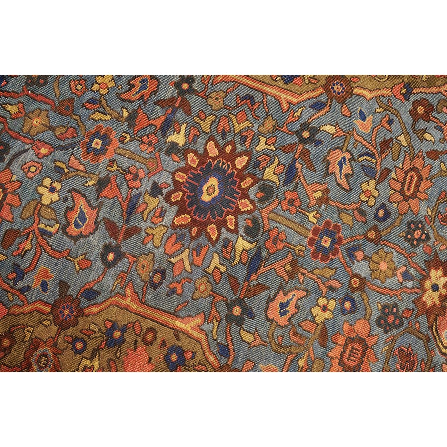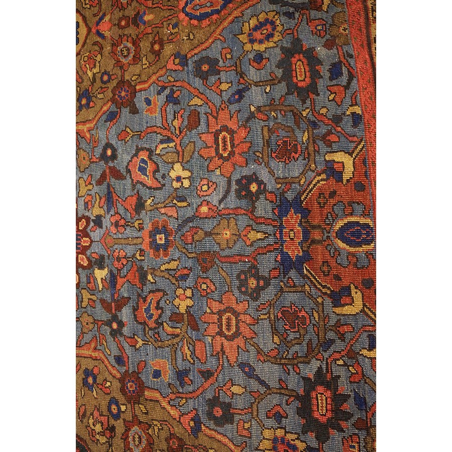 Arak province in western Iran encompasses the town of Sultanabad and various satellite villages, all of which weave for export:the sarouk, Mahal and MushKabad. The latter two grades comprise the sultanabad production. Virtually all are large carpets, up to 16’ x 25’, with overall, or medallions on decorated or open fields, in soft to bright colors on a cotton foundation, the pile is lowish. The design corpus includes the ever popular Herati, the Harshang palmette motif, rosettes and arabesques, small repeated medallions, etc. The weave varies from coarse to medium. Today, the soft colored pieces with bold patterns are particularly favored. Prices range widely, low for commercial pieces 50 years old, astronomical for light colored Zieglers (see below).