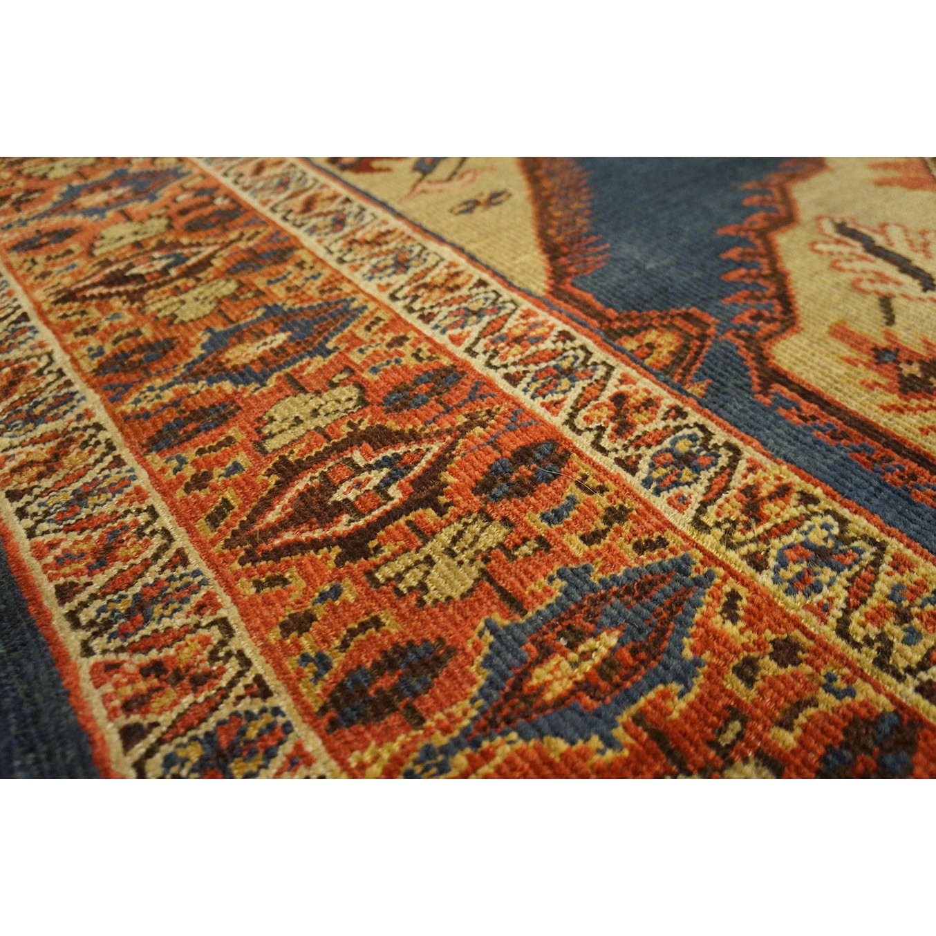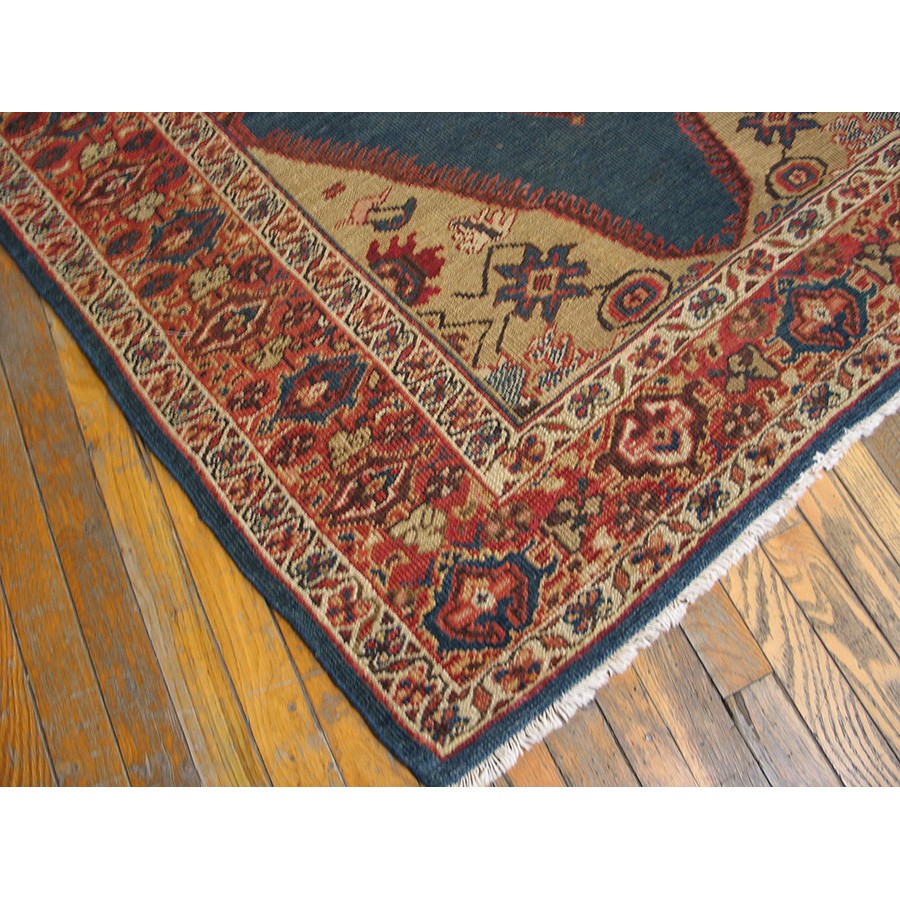 Arak province in western Iran encompasses the town of Sultanabad and various satellite villages, all of which weave for export:the sarouk, Mahal and MushKabad. The latter two grades comprise the sultanabad production. Virtually all are large carpets, up to 16’ x 25’, with overall, or medallions on decorated or open fields, in soft to bright colors on a cotton foundation, the pile is lowish. The design corpus includes the ever popular Herati, the Harshang palmette motif, rosettes and arabesques, small repeated medallions, etc. The weave varies from coarse to medium. Today, the soft colored pieces with bold patterns are particularly favored. Prices range widely, low for commercial pieces 50 years old, astronomical for light colored Zieglers (see below).