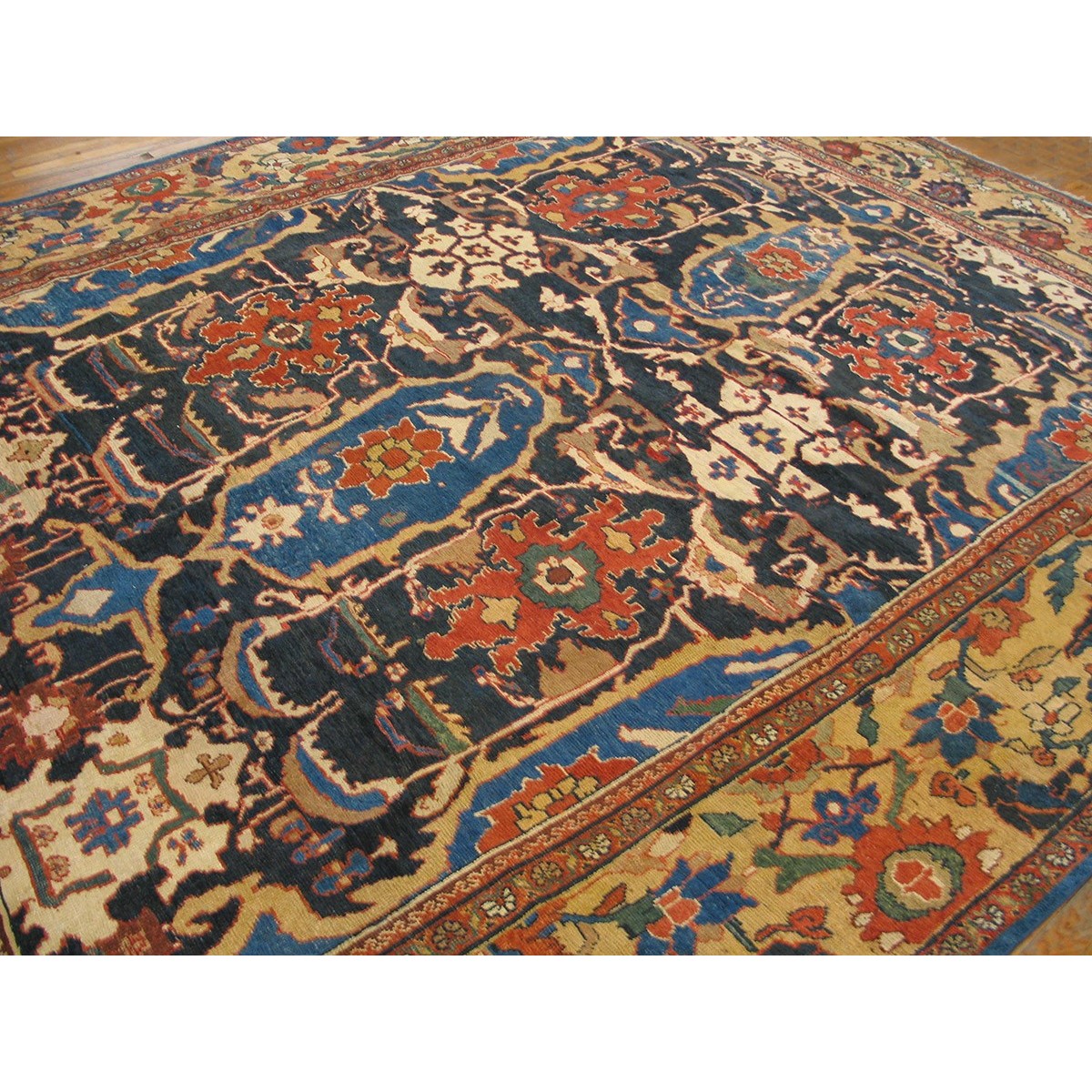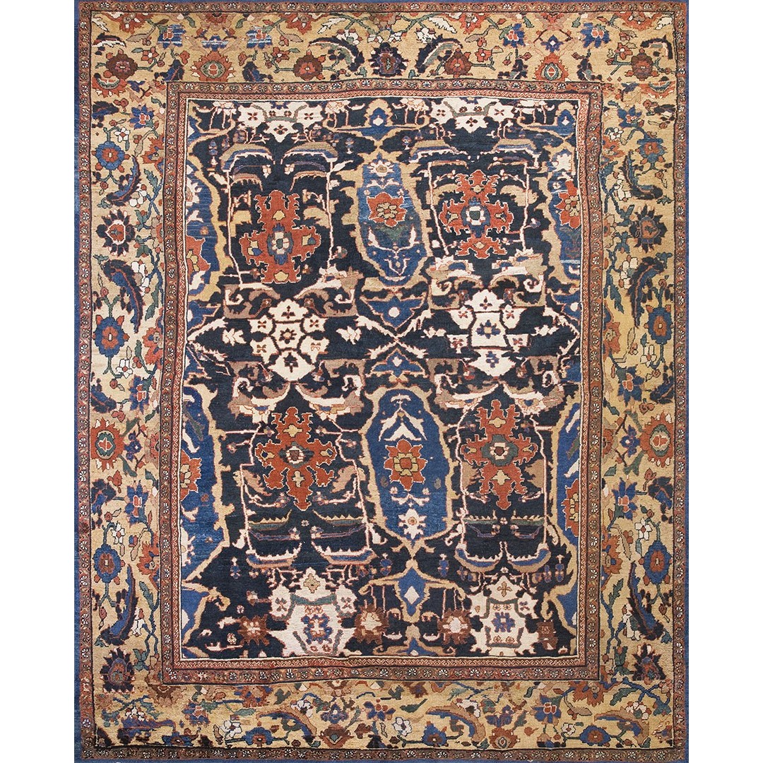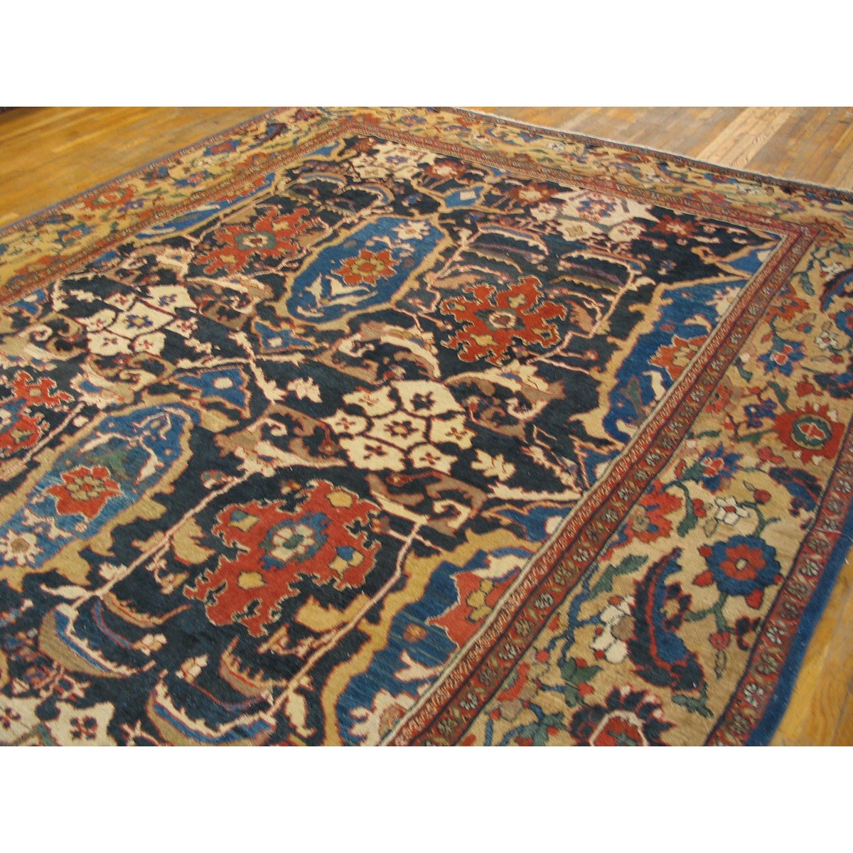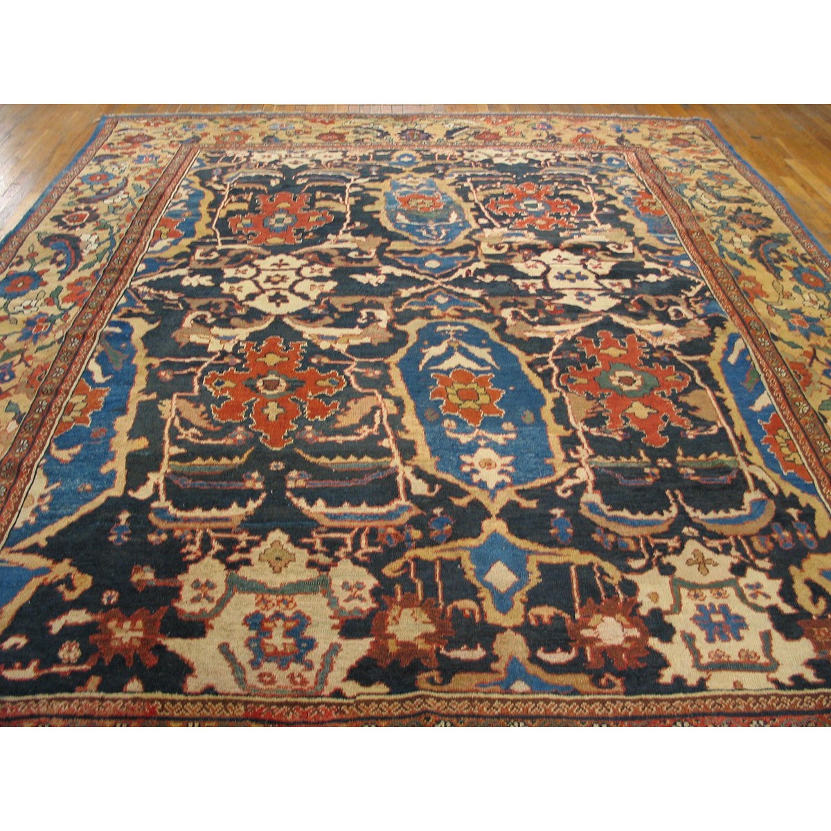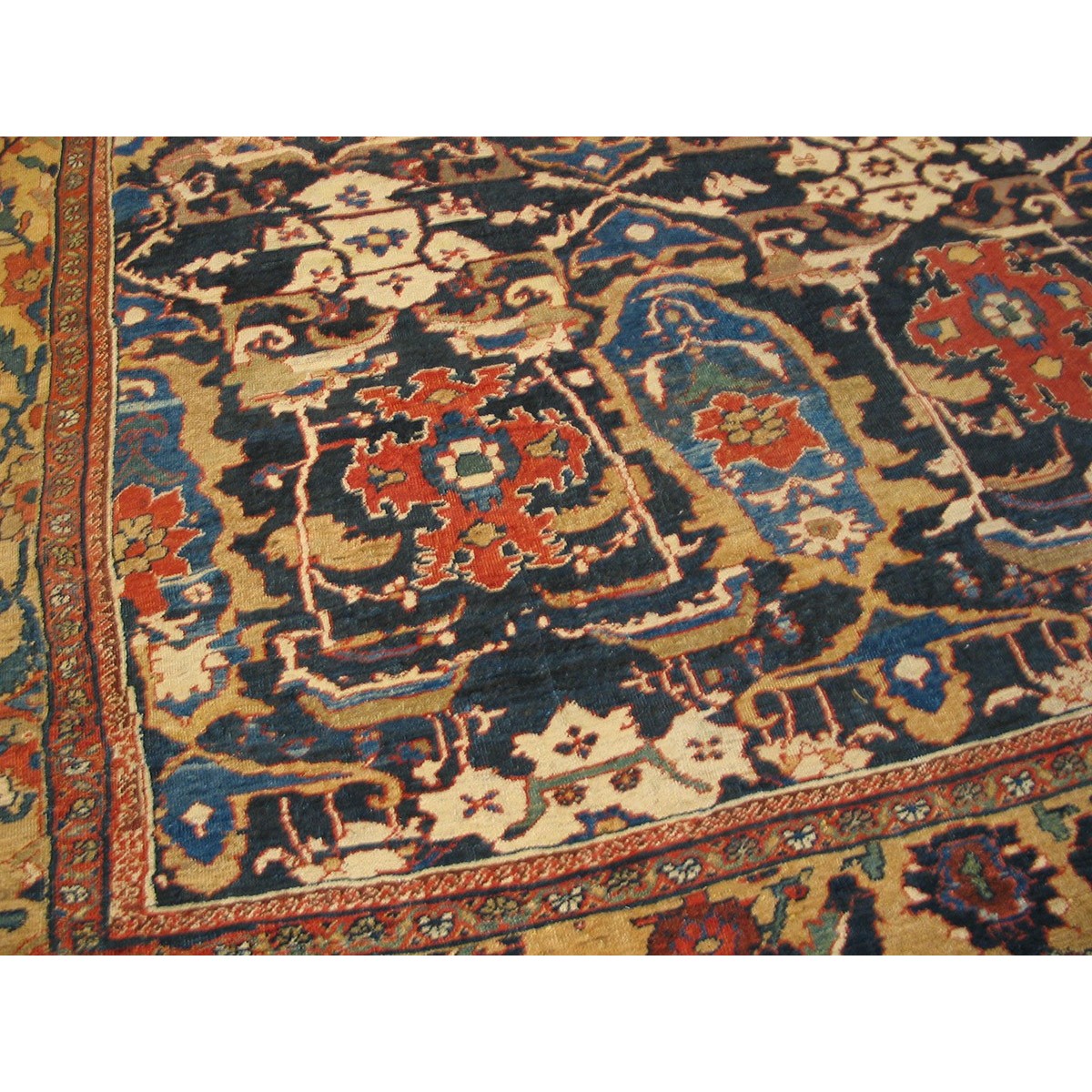 DescriptionSultanabadArak province in western Iran encompasses the town of Sultanabad and various satellite villages, all of which weave for export:the sarouk, Mahal and MushKabad. The latter two grades comprise the sultanabad production. Virtually all are large carpets, up to 16 x 25, with overall, or medallions on decorated or open fields, in soft to bright colors on a cotton foundation, the pile is lowish. The design corpus includes the ever popular Herati, the Harshang palmette motif, rosettes and arabesques, small repeated medallions, etc. The weave varies from coarse to medium. Today, the soft colored pieces with bold patterns are particularly favored. Prices range widely, low for commercial pieces 50 years old, astronomical for light colored Zieglers (see below). | |