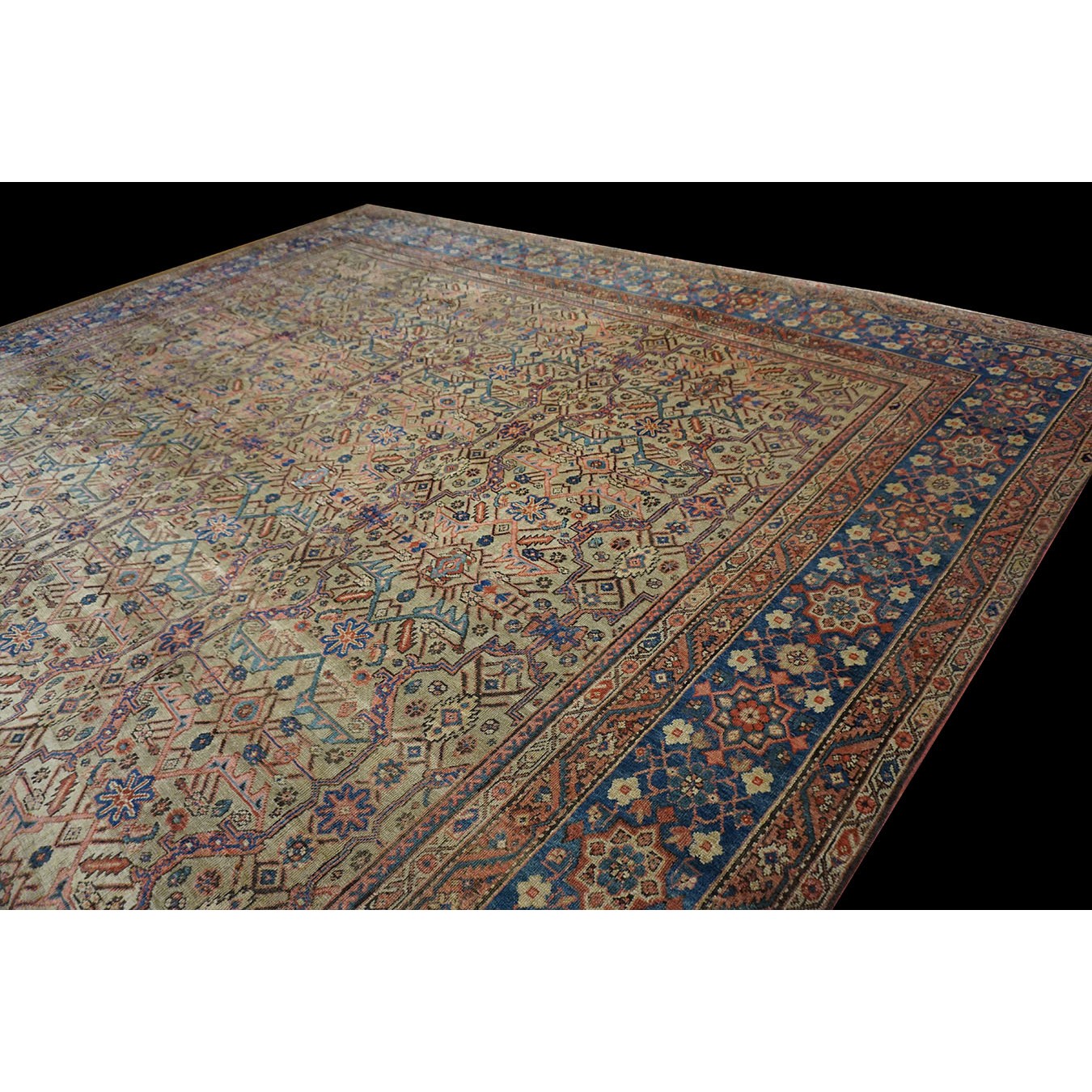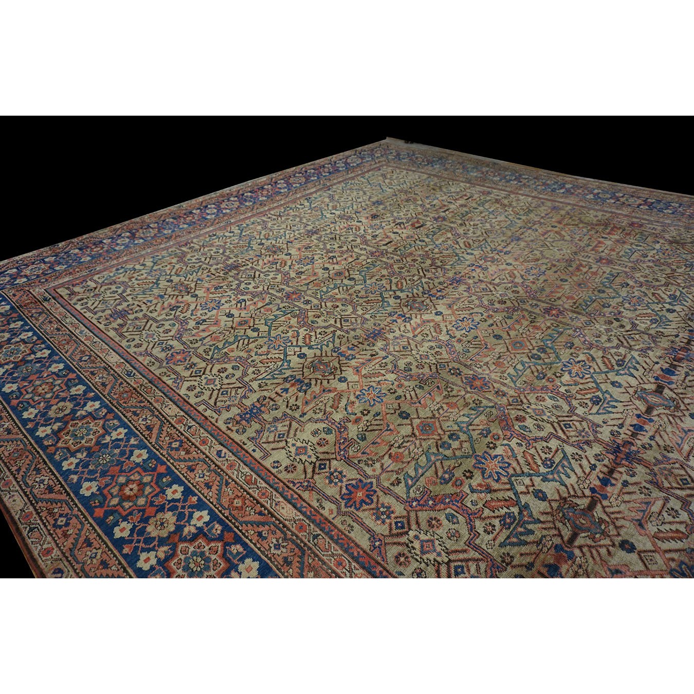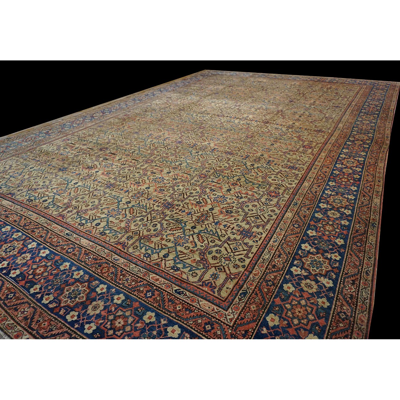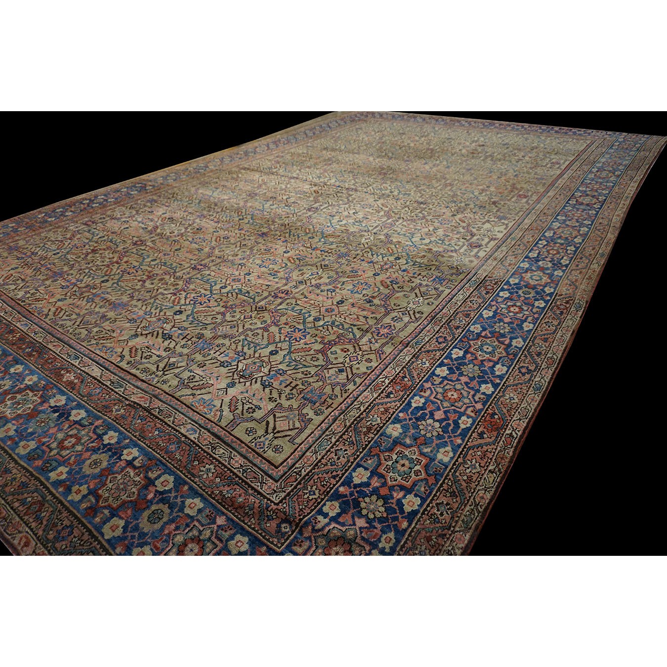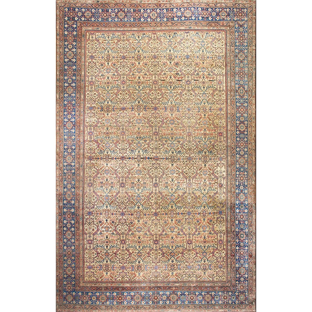 DescriptionSultanabadArak province in western Iran encompasses the town of Sultanabad and various satellite villages, all of which weave for export:the sarouk, Mahal and MushKabad. The latter two grades comprise the sultanabad production. Virtually all are large carpets, up to 16 x 25, with overall, or medallions on decorated or open fields, in soft to bright colors on a cotton foundation, the pile is lowish. The design corpus includes the ever popular Herati, the Harshang palmette motif, rosettes and arabesques, small repeated medallions, etc. The weave varies from coarse to medium. Today, the soft colored pieces with bold patterns are particularly favored. Prices range widely, low for commercial pieces 50 years old, astronomical for light colored Zieglers (see below). | |