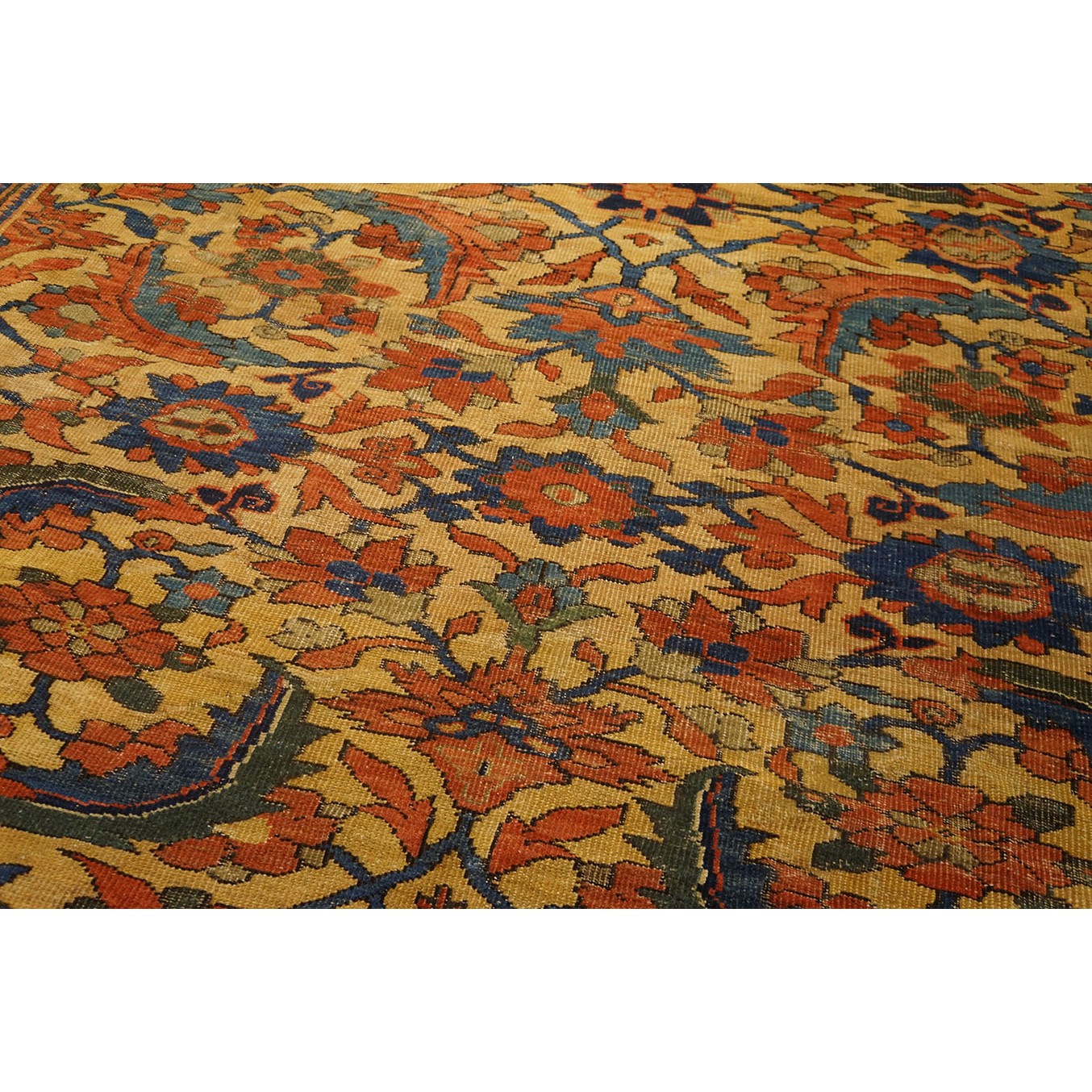 DescriptionSultanabadArak province in western Iran encompasses the town of Sultanabad and various satellite villages, all of which weave for export:the sarouk, Mahal and MushKabad. The latter two grades comprise the sultanabad production. Virtually all are large carpets, up to 16 x 25, with overall, or medallions on decorated or open fields, in soft to bright colors on a cotton foundation, the pile is lowish. The design corpus includes the ever popular Herati, the Harshang palmette motif, rosettes and arabesques, small repeated medallions, etc. The weave varies from coarse to medium. Today, the soft colored pieces with bold patterns are particularly favored. Prices range widely, low for commercial pieces 50 years old, astronomical for light colored Zieglers (see below). | |