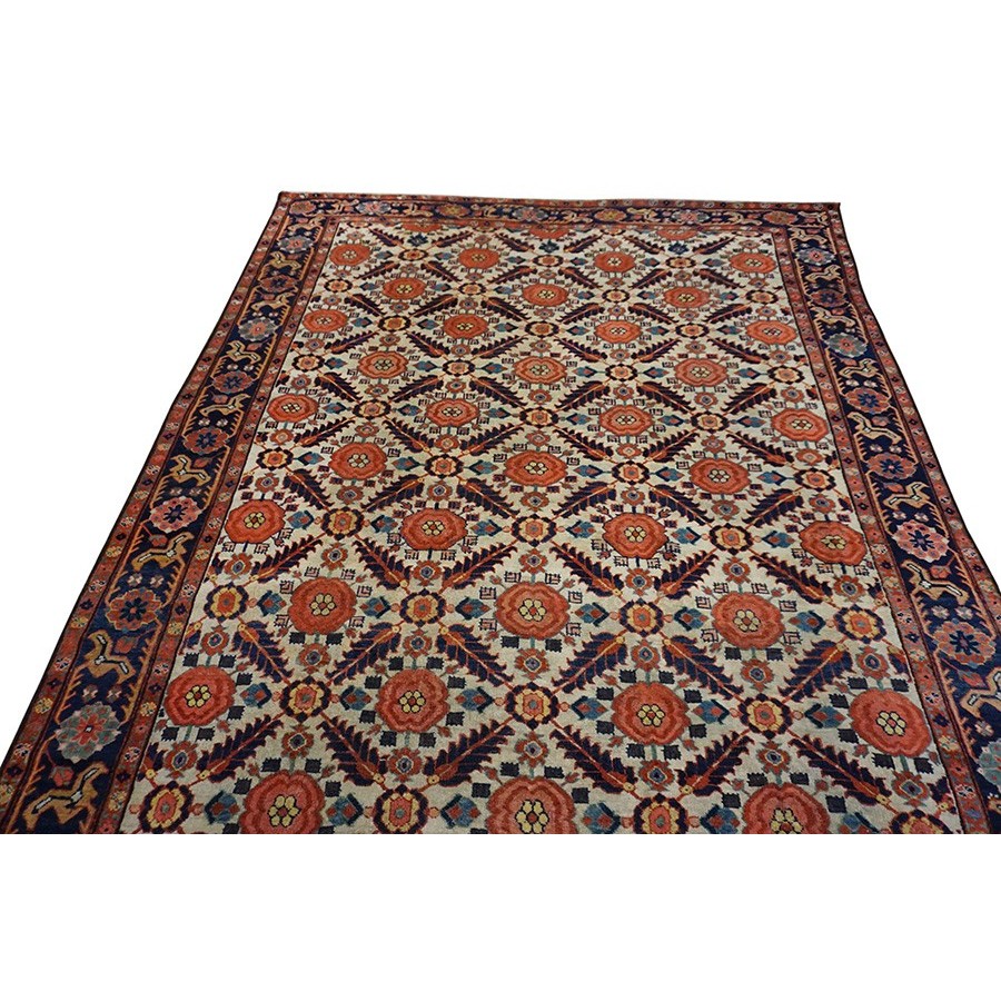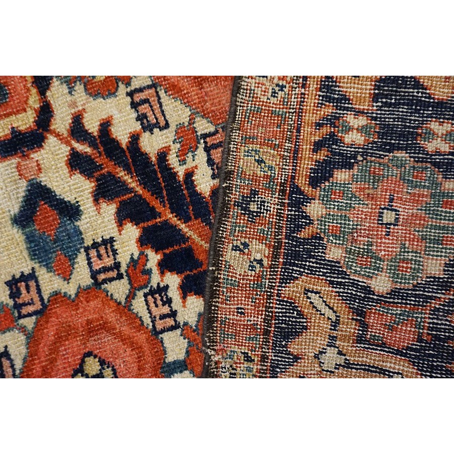DescriptionSultanabadArak province in western Iran encompasses the town of Sultanabad and various satellite villages, all of which weave for export:the sarouk, Mahal and MushKabad. The latter two grades comprise the sultanabad production. Virtually all are large carpets, up to 16 x 25, with overall, or medallions on decorated or open fields, in soft to bright colors on a cotton foundation, the pile is lowish. The design corpus includes the ever popular Herati, the Harshang palmette motif, rosettes and arabesques, small repeated medallions, etc. The weave varies from coarse to medium. Today, the soft colored pieces with bold patterns are particularly favored. Prices range widely, low for commercial pieces 50 years old, astronomical for light colored Zieglers (see below). | |