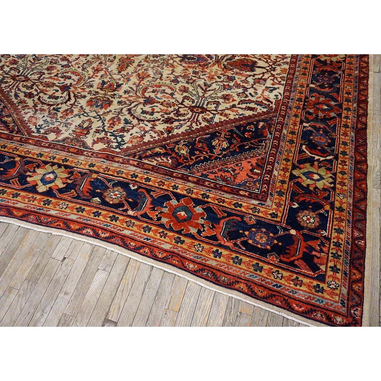 DescriptionSultanabadArak province in western Iran encompasses the town of Sultanabad and various satellite villages, all of which weave for export:the sarouk, Mahal and MushKabad. The latter two grades comprise the sultanabad production. Virtually all are large carpets, up to 16 x 25, with overall, or medallions on decorated or open fields, in soft to bright colors on a cotton foundation, the pile is lowish. The design corpus includes the ever popular Herati, the Harshang palmette motif, rosettes and arabesques, small repeated medallions, etc. The weave varies from coarse to medium. Today, the soft colored pieces with bold patterns are particularly favored. Prices range widely, low for commercial pieces 50 years old, astronomical for light colored Zieglers (see below). | |