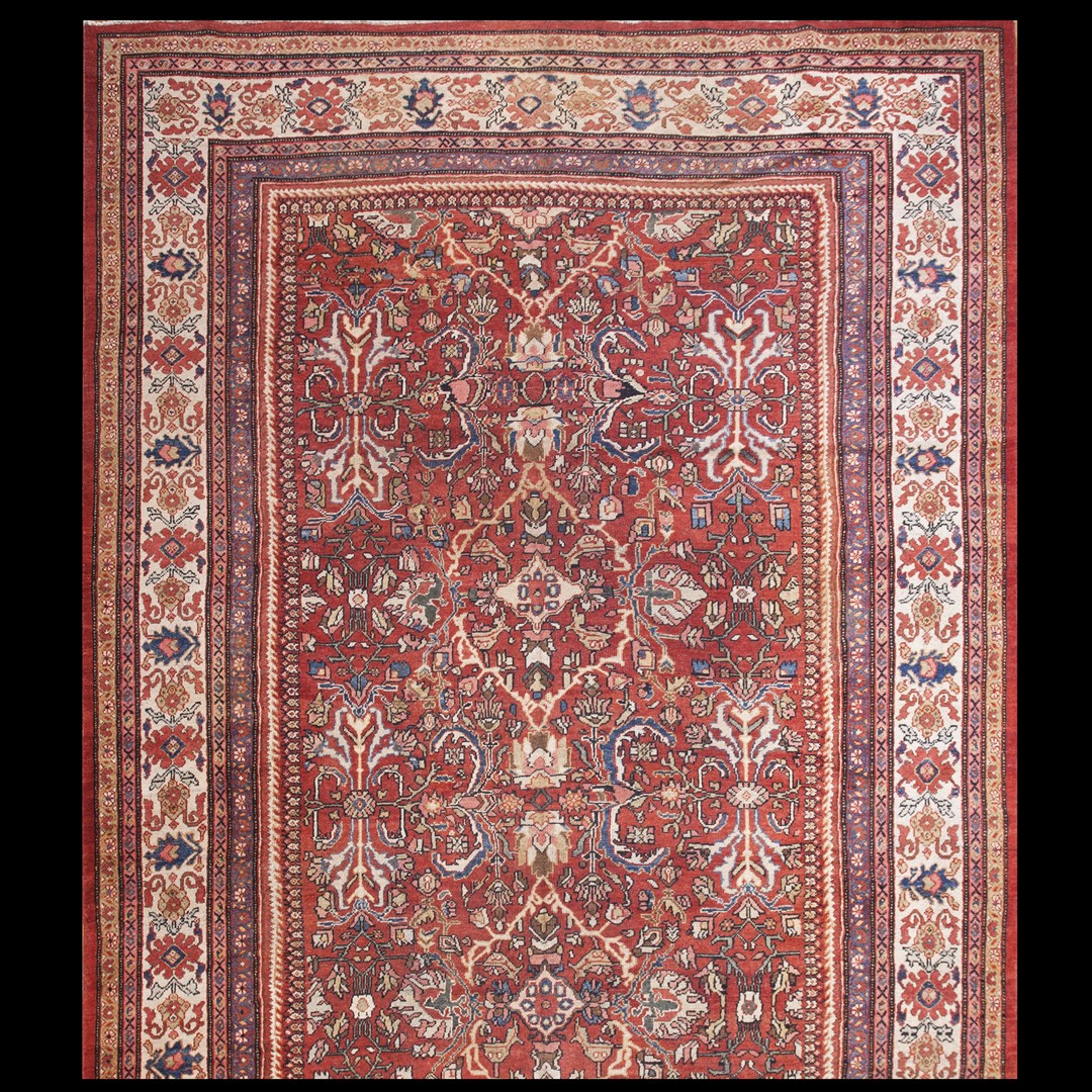 DescriptionSultanabadArak province in western Iran encompasses the town of Sultanabad and various satellite villages, all of which weave for export:the sarouk, Mahal and MushKabad. The latter two grades comprise the sultanabad production. Virtually all are large carpets, up to 16 x 25, with overall, or medallions on decorated or open fields, in soft to bright colors on a cotton foundation, the pile is lowish. The design corpus includes the ever popular Herati, the Harshang palmette motif, rosettes and arabesques, small repeated medallions, etc. The weave varies from coarse to medium. Today, the soft colored pieces with bold patterns are particularly favored. Prices range widely, low for commercial pieces 50 years old, astronomical for light colored Zieglers (see below). | |