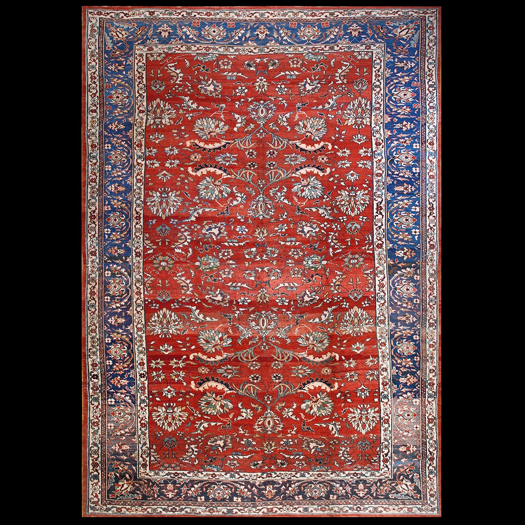 DescriptionSultanabadArak province in western Iran encompasses the town of Sultanabad and various satellite villages, all of which weave for export:the sarouk, Mahal and MushKabad. The latter two grades comprise the sultanabad production. Virtually all are large carpets, up to 16 x 25, with overall, or medallions on decorated or open fields, in soft to bright colors on a cotton foundation, the pile is lowish. The design corpus includes the ever popular Herati, the Harshang palmette motif, rosettes and arabesques, small repeated medallions, etc. The weave varies from coarse to medium. Today, the soft colored pieces with bold patterns are particularly favored. Prices range widely, low for commercial pieces 50 years old, astronomical for light colored Zieglers (see below). | |