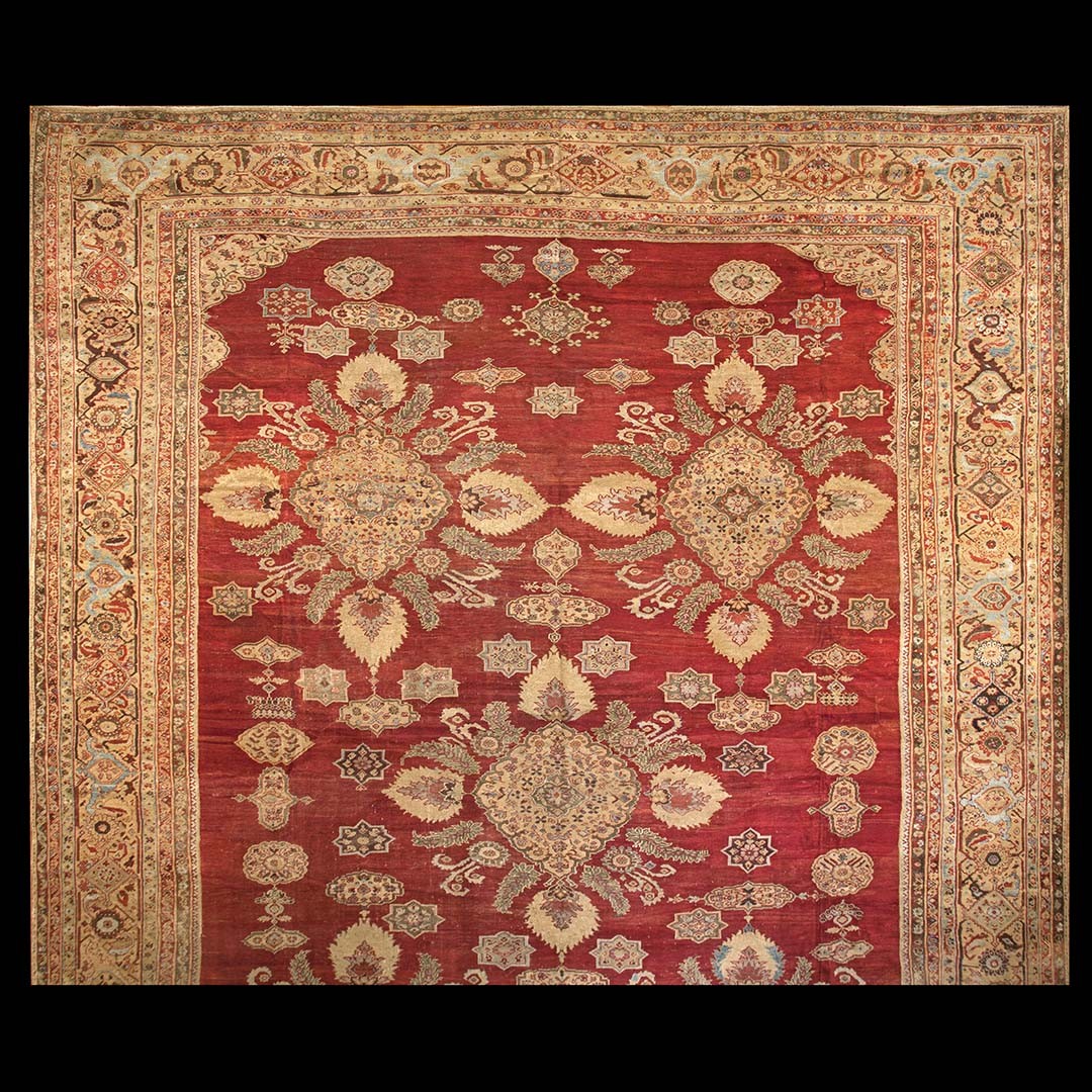 DescriptionSultanabadArak province in western Iran encompasses the town of Sultanabad and various satellite villages, all of which weave for export:the sarouk, Mahal and MushKabad. The latter two grades comprise the sultanabad production. Virtually all are large carpets, up to 16 x 25, with overall, or medallions on decorated or open fields, in soft to bright colors on a cotton foundation, the pile is lowish. The design corpus includes the ever popular Herati, the Harshang palmette motif, rosettes and arabesques, small repeated medallions, etc. The weave varies from coarse to medium. Today, the soft colored pieces with bold patterns are particularly favored. Prices range widely, low for commercial pieces 50 years old, astronomical for light colored Zieglers (see below). | |