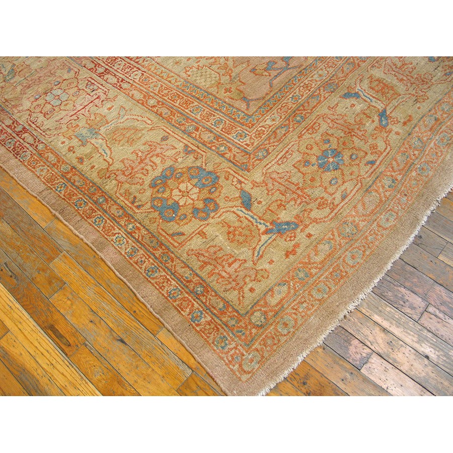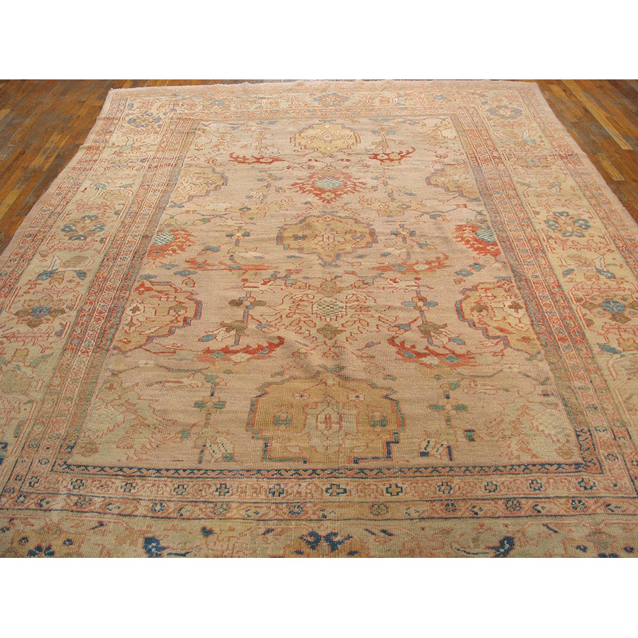 DescriptionSultanabadArak province in western Iran encompasses the town of Sultanabad and various satellite villages, all of which weave for export:the sarouk, Mahal and MushKabad. The latter two grades comprise the sultanabad production. Virtually all are large carpets, up to 16 x 25, with overall, or medallions on decorated or open fields, in soft to bright colors on a cotton foundation, the pile is lowish. The design corpus includes the ever popular Herati, the Harshang palmette motif, rosettes and arabesques, small repeated medallions, etc. The weave varies from coarse to medium. Today, the soft colored pieces with bold patterns are particularly favored. Prices range widely, low for commercial pieces 50 years old, astronomical for light colored Zieglers (see below). | |