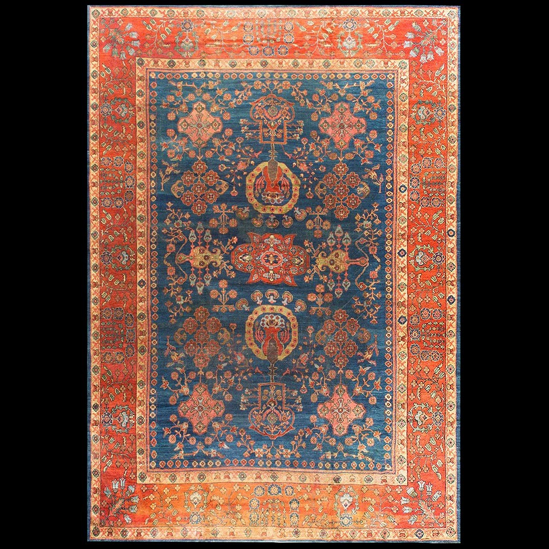 DescriptionSultanabadArak province in western Iran encompasses the town of Sultanabad and various satellite villages, all of which weave for export:the sarouk, Mahal and MushKabad. The latter two grades comprise the sultanabad production. Virtually all are large carpets, up to 16 x 25, with overall, or medallions on decorated or open fields, in soft to bright colors on a cotton foundation, the pile is lowish. The design corpus includes the ever popular Herati, the Harshang palmette motif, rosettes and arabesques, small repeated medallions, etc. The weave varies from coarse to medium. Today, the soft colored pieces with bold patterns are particularly favored. Prices range widely, low for commercial pieces 50 years old, astronomical for light colored Zieglers (see below). | |