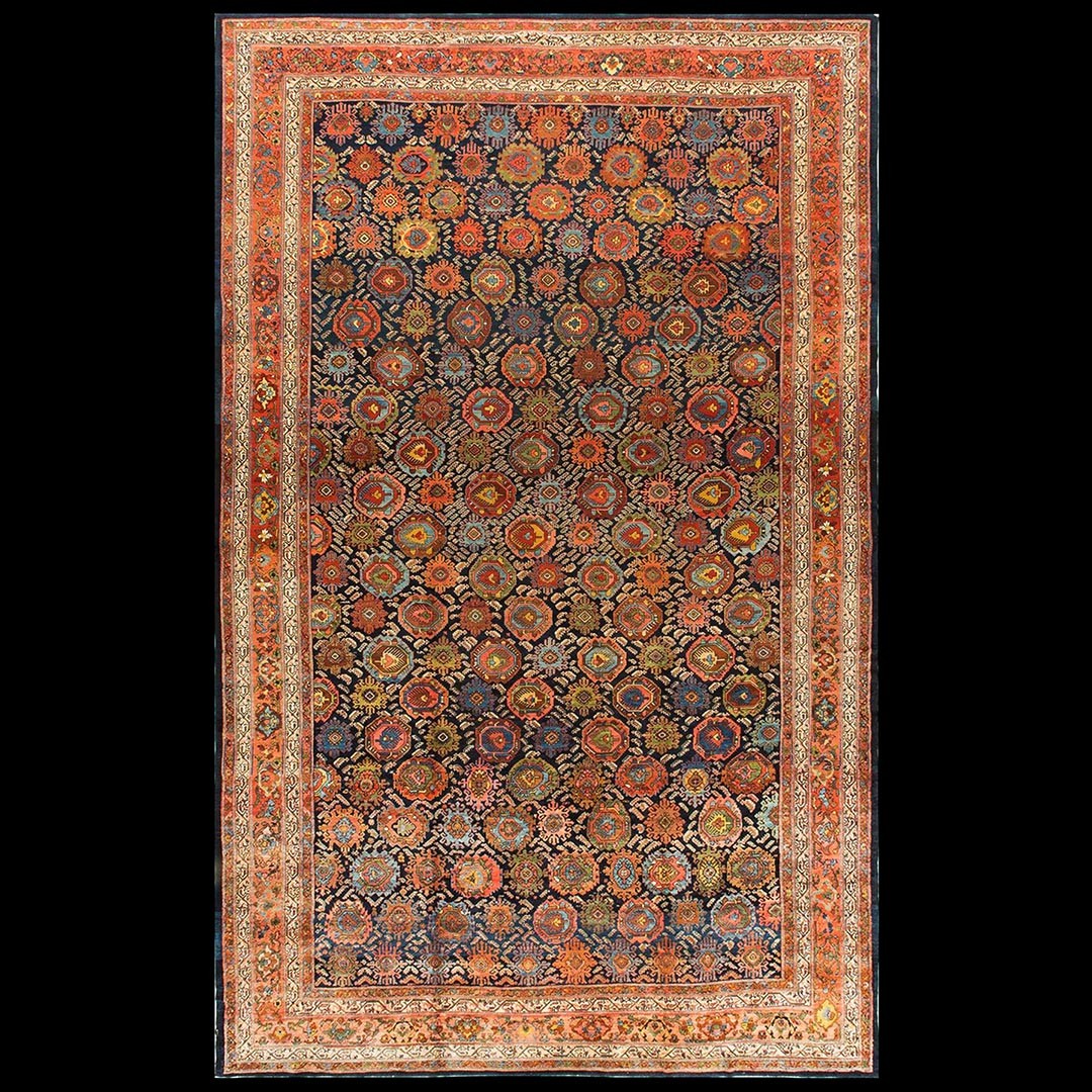 DescriptionSultanabadArak province in western Iran encompasses the town of Sultanabad and various satellite villages, all of which weave for export:the sarouk, Mahal and MushKabad. The latter two grades comprise the sultanabad production. Virtually all are large carpets, up to 16 x 25, with overall, or medallions on decorated or open fields, in soft to bright colors on a cotton foundation, the pile is lowish. The design corpus includes the ever popular Herati, the Harshang palmette motif, rosettes and arabesques, small repeated medallions, etc. The weave varies from coarse to medium. Today, the soft colored pieces with bold patterns are particularly favored. Prices range widely, low for commercial pieces 50 years old, astronomical for light colored Zieglers (see below). | |