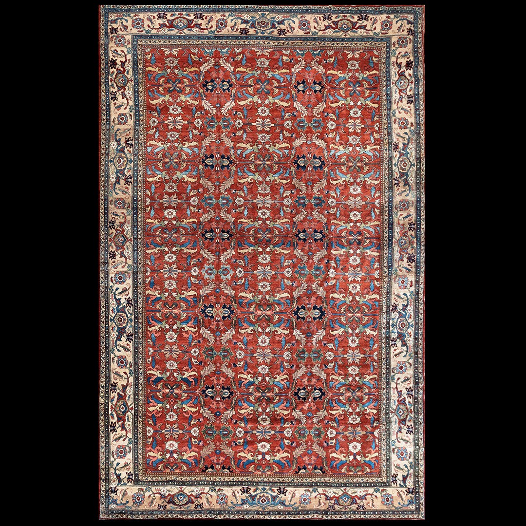 DescriptionSultanabadArak province in western Iran encompasses the town of Sultanabad and various satellite villages, all of which weave for export:the sarouk, Mahal and MushKabad. The latter two grades comprise the sultanabad production. Virtually all are large carpets, up to 16 x 25, with overall, or medallions on decorated or open fields, in soft to bright colors on a cotton foundation, the pile is lowish. The design corpus includes the ever popular Herati, the Harshang palmette motif, rosettes and arabesques, small repeated medallions, etc. The weave varies from coarse to medium. Today, the soft colored pieces with bold patterns are particularly favored. Prices range widely, low for commercial pieces 50 years old, astronomical for light colored Zieglers (see below). | |