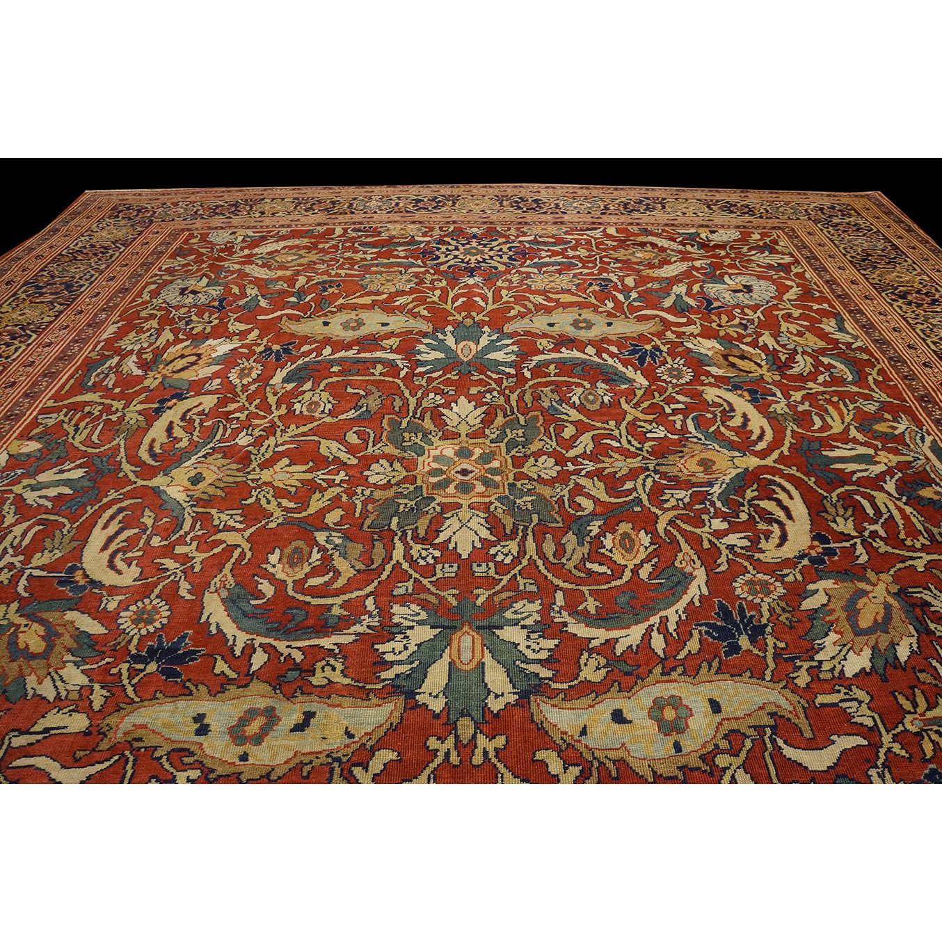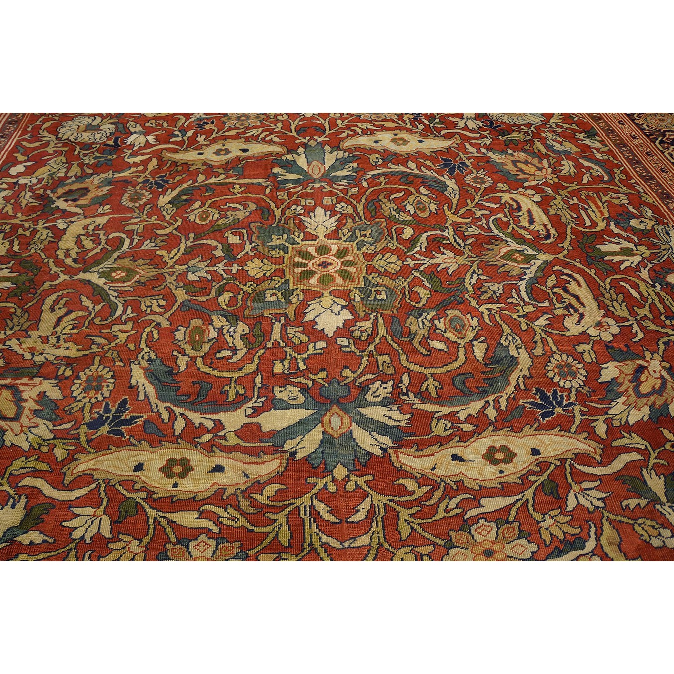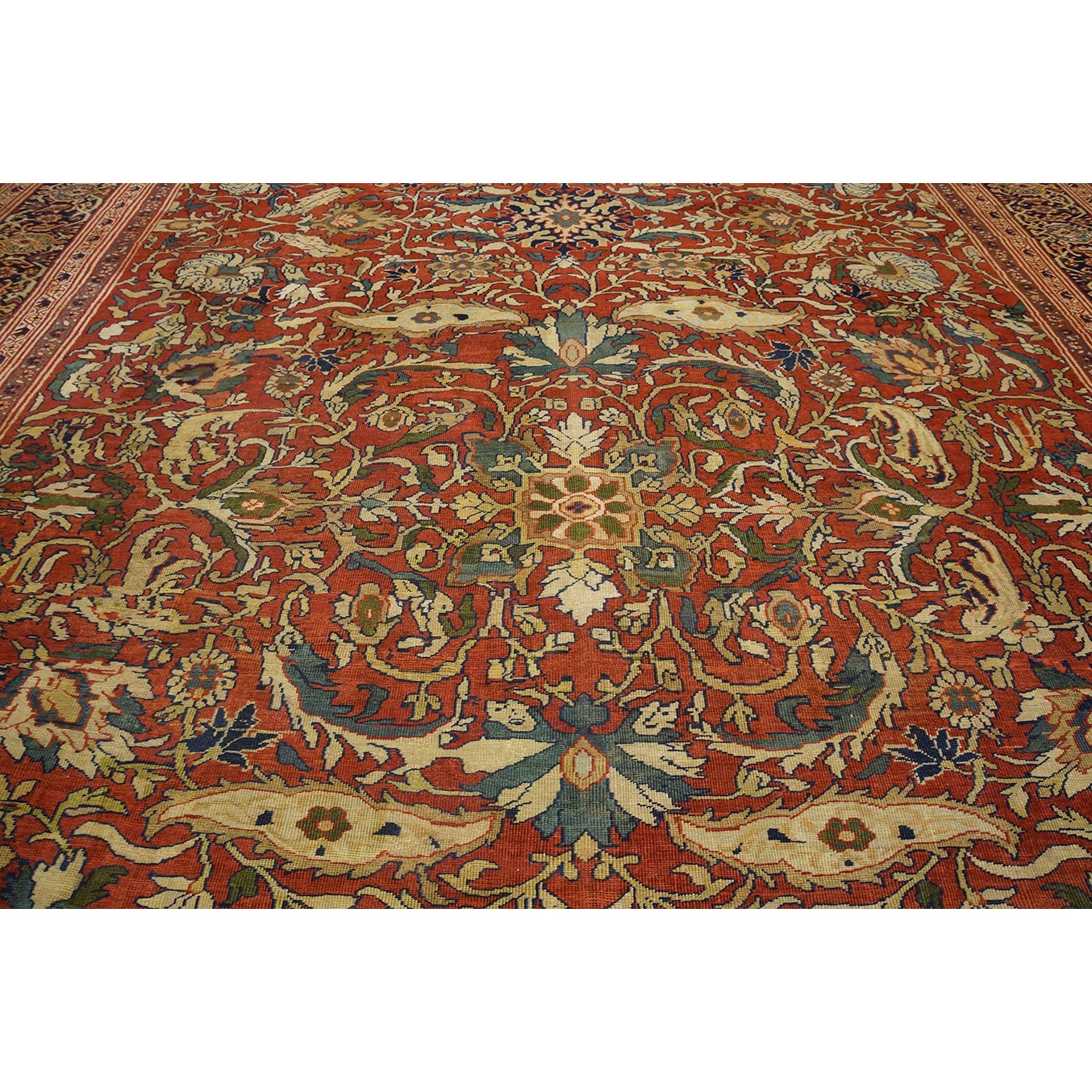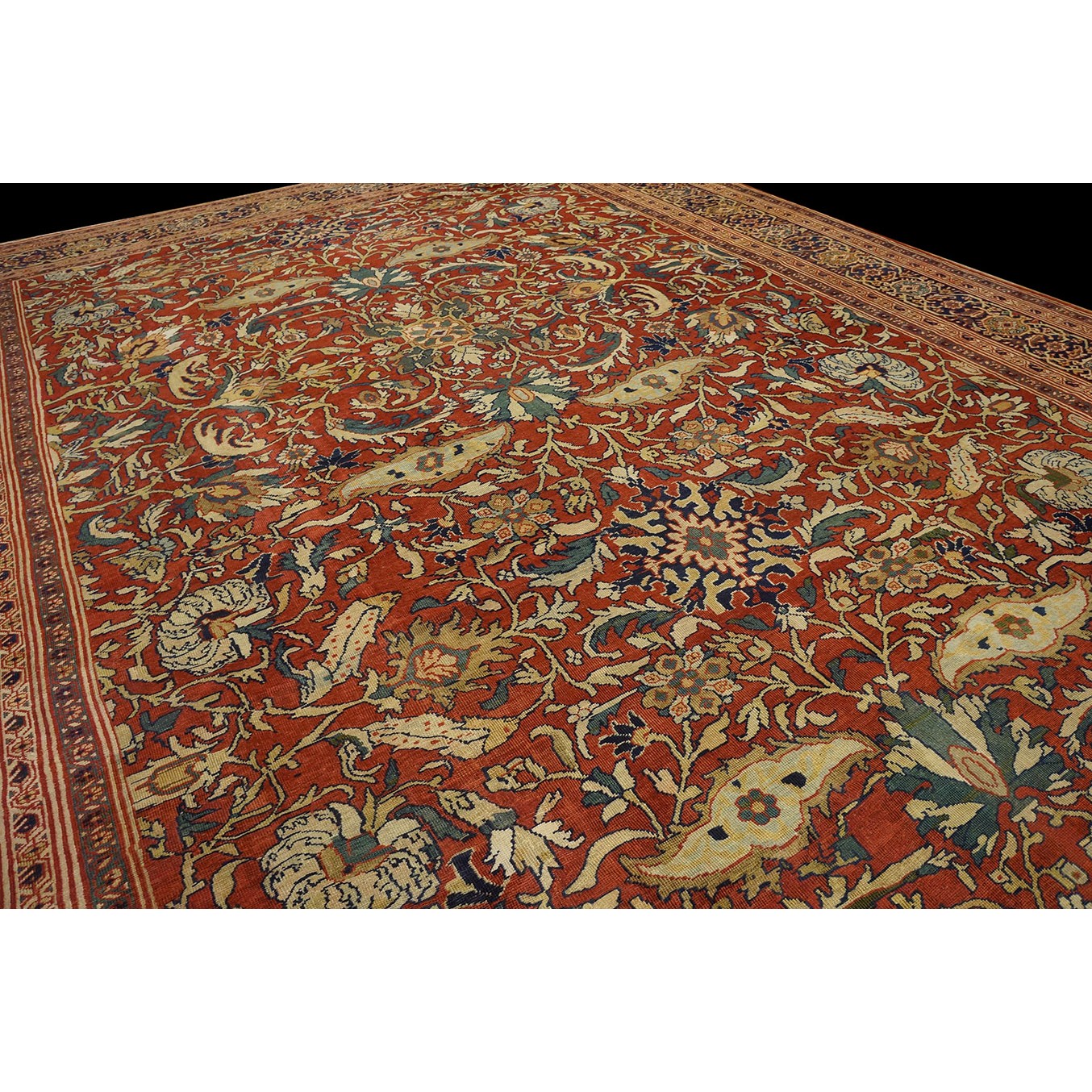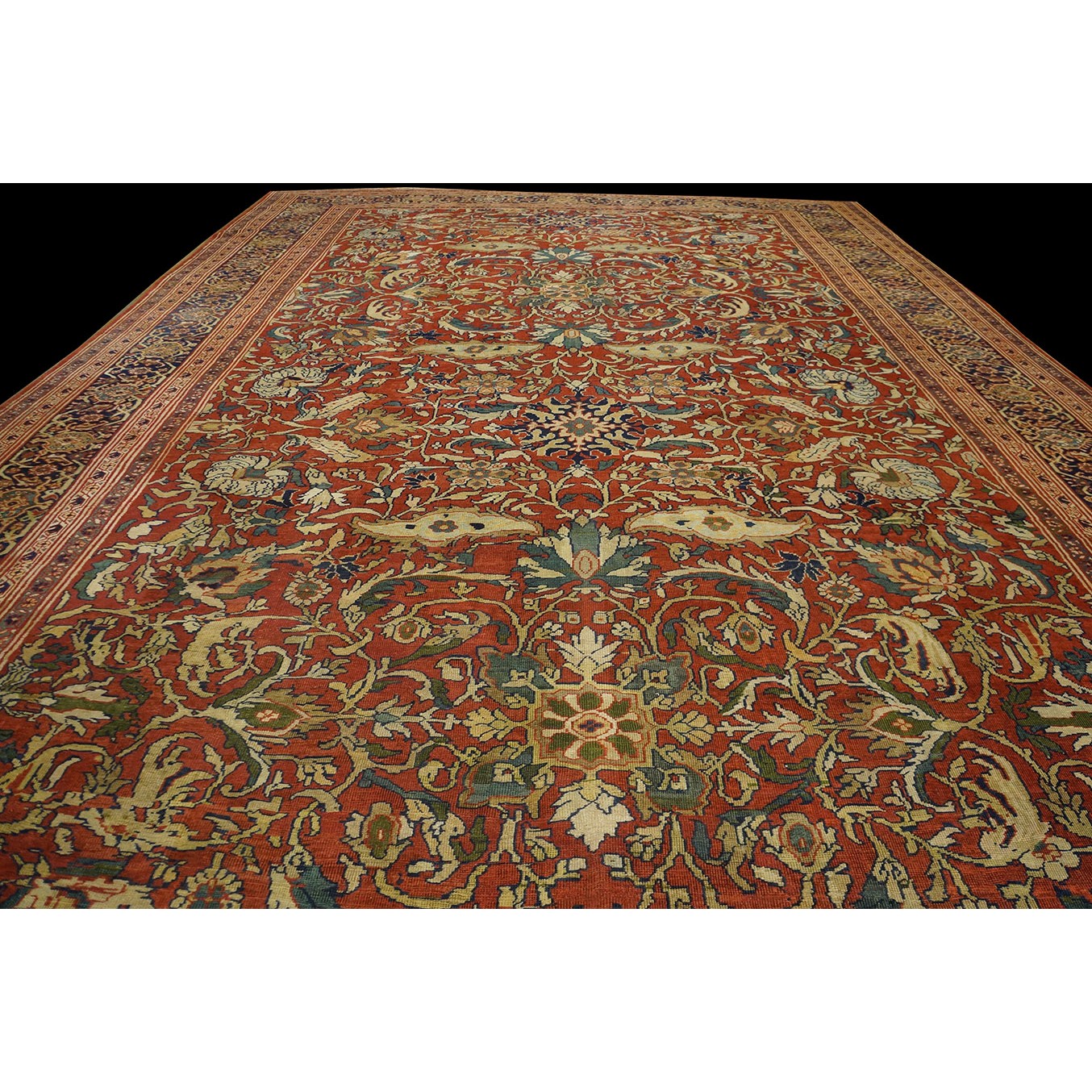 DescriptionSultanabadArak province in western Iran encompasses the town of Sultanabad and various satellite villages, all of which weave for export:the sarouk, Mahal and MushKabad. The latter two grades comprise the sultanabad production. Virtually all are large carpets, up to 16 x 25, with overall, or medallions on decorated or open fields, in soft to bright colors on a cotton foundation, the pile is lowish. The design corpus includes the ever popular Herati, the Harshang palmette motif, rosettes and arabesques, small repeated medallions, etc. The weave varies from coarse to medium. Today, the soft colored pieces with bold patterns are particularly favored. Prices range widely, low for commercial pieces 50 years old, astronomical for light colored Zieglers (see below). | |