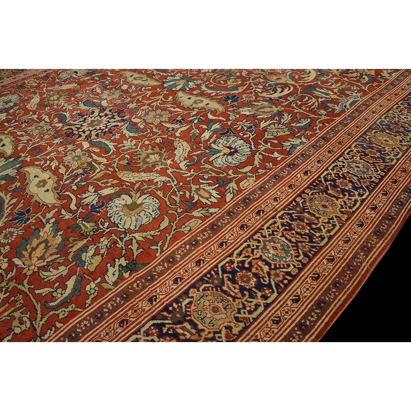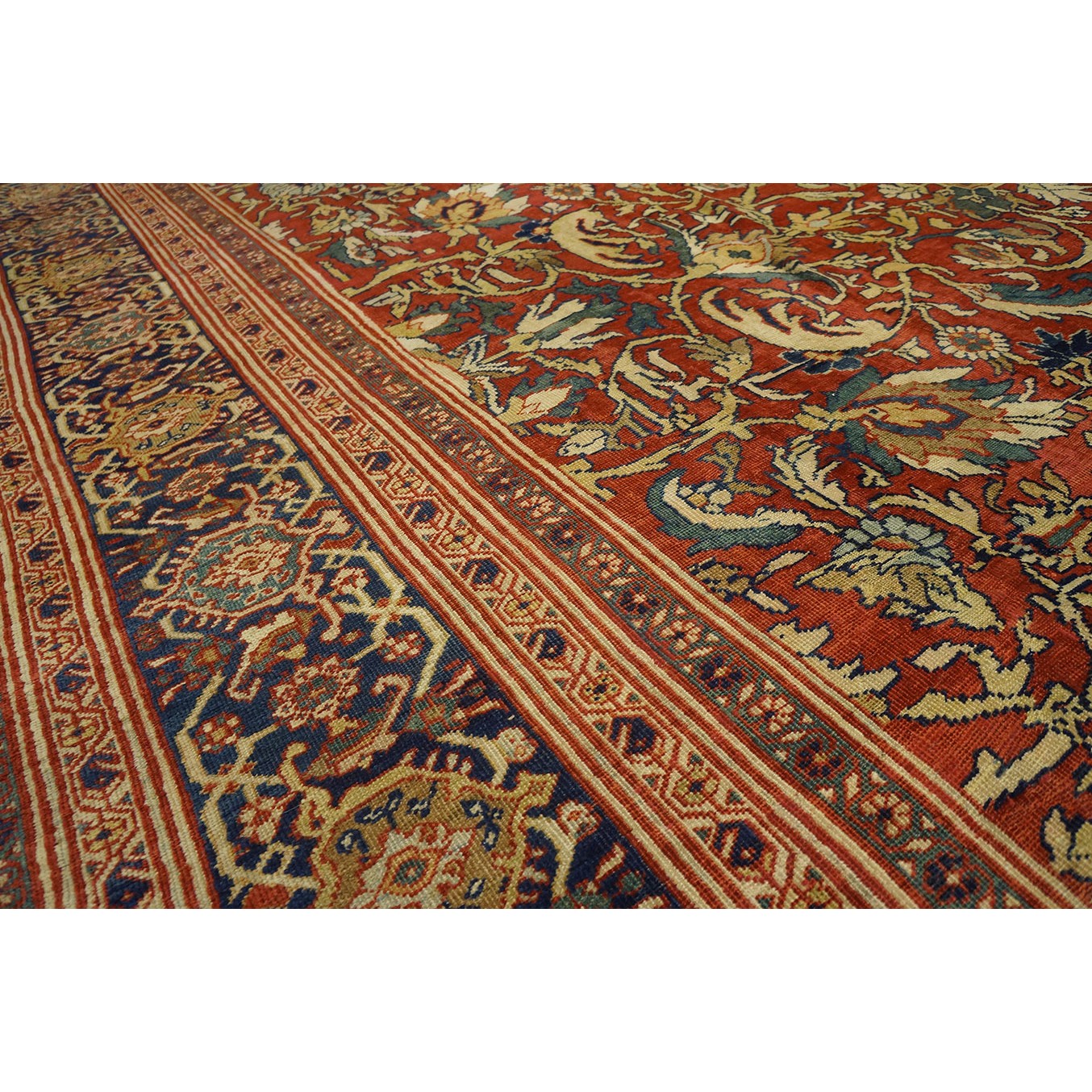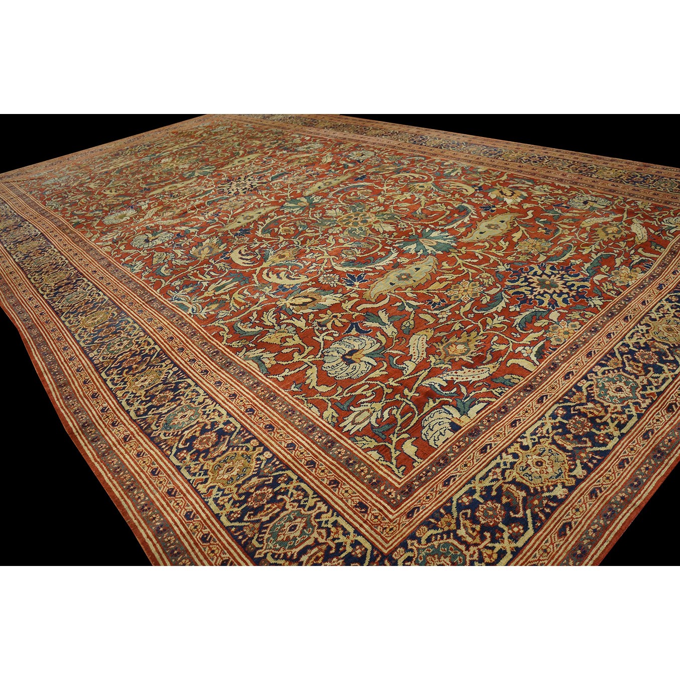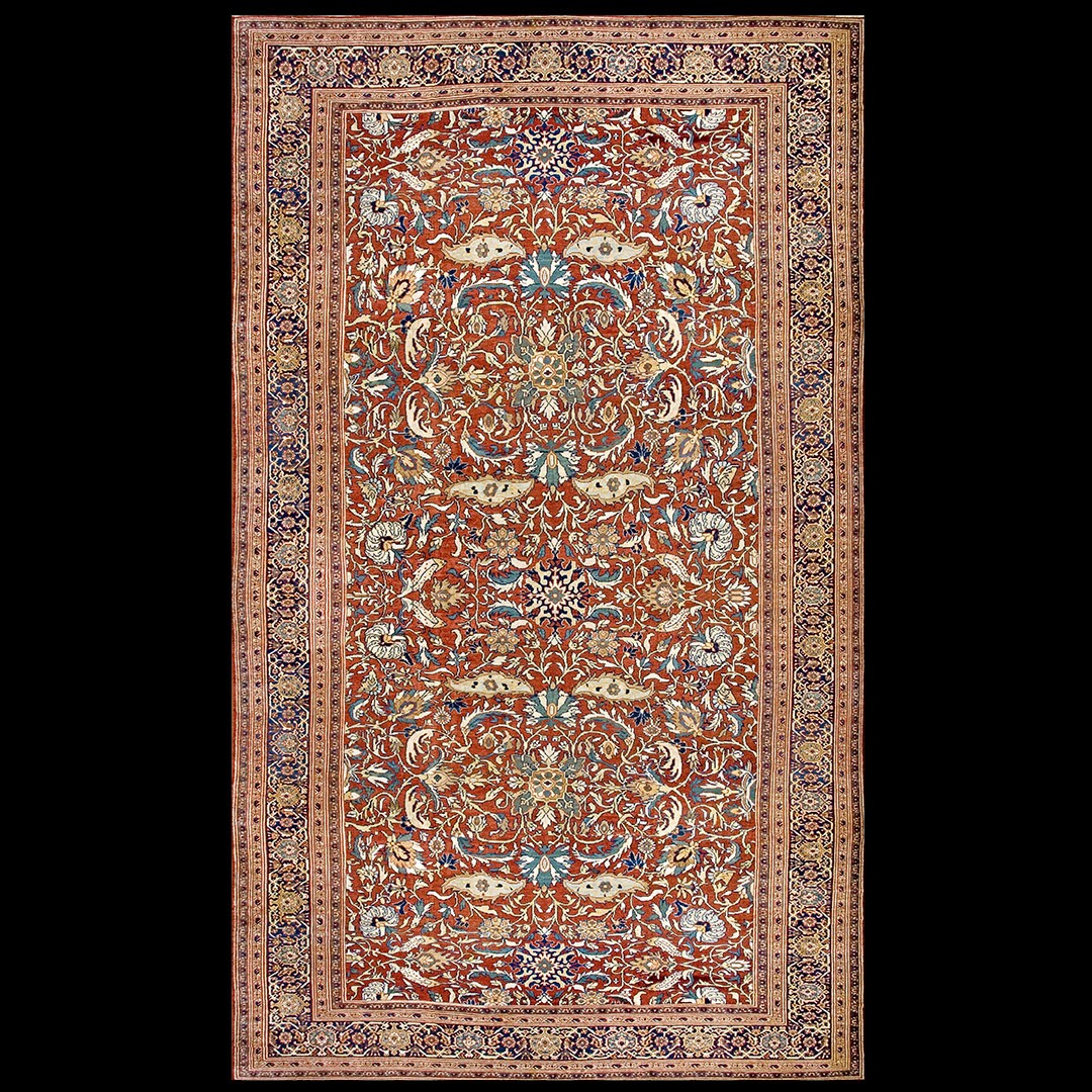 DescriptionSultanabadArak province in western Iran encompasses the town of Sultanabad and various satellite villages, all of which weave for export:the sarouk, Mahal and MushKabad. The latter two grades comprise the sultanabad production. Virtually all are large carpets, up to 16 x 25, with overall, or medallions on decorated or open fields, in soft to bright colors on a cotton foundation, the pile is lowish. The design corpus includes the ever popular Herati, the Harshang palmette motif, rosettes and arabesques, small repeated medallions, etc. The weave varies from coarse to medium. Today, the soft colored pieces with bold patterns are particularly favored. Prices range widely, low for commercial pieces 50 years old, astronomical for light colored Zieglers (see below). | |