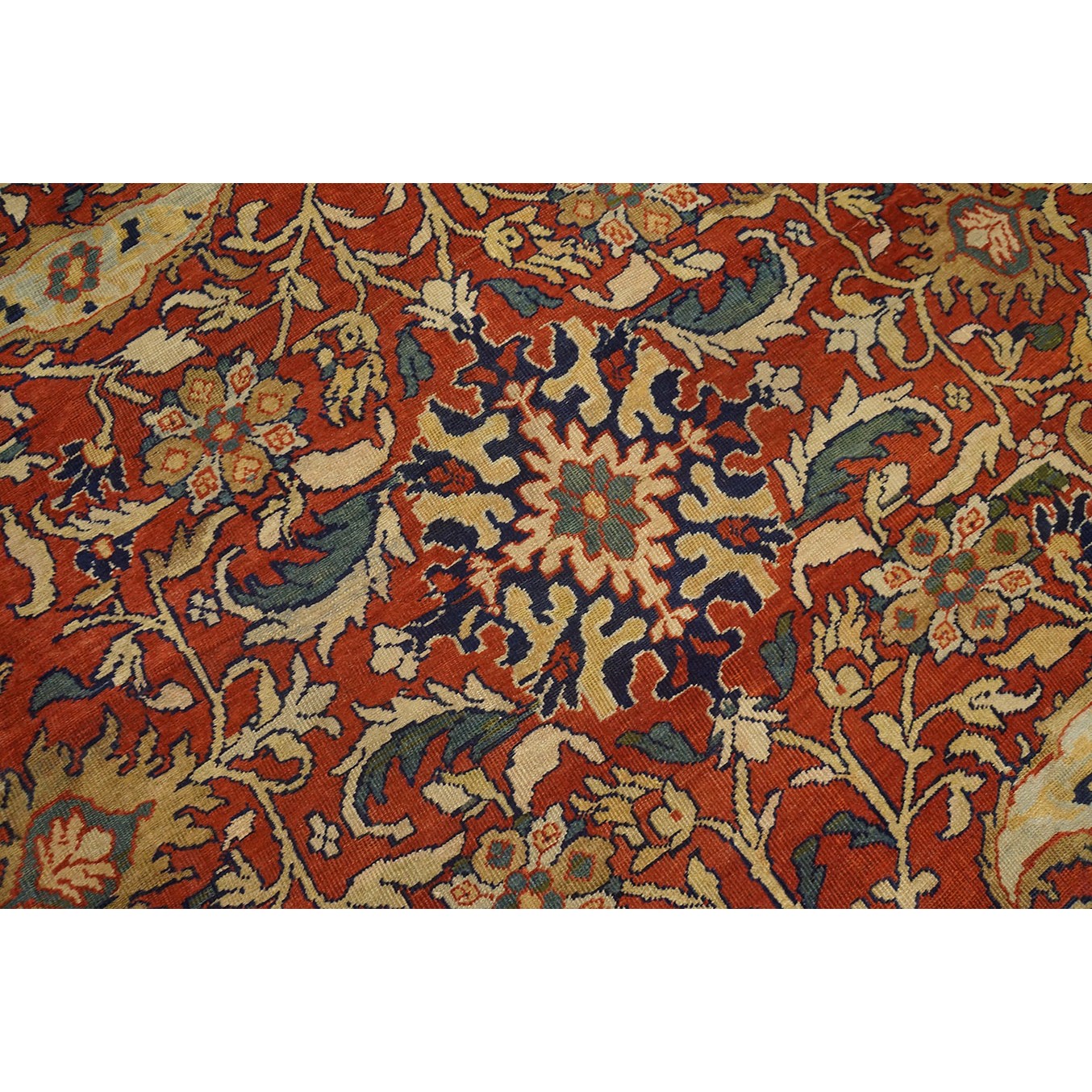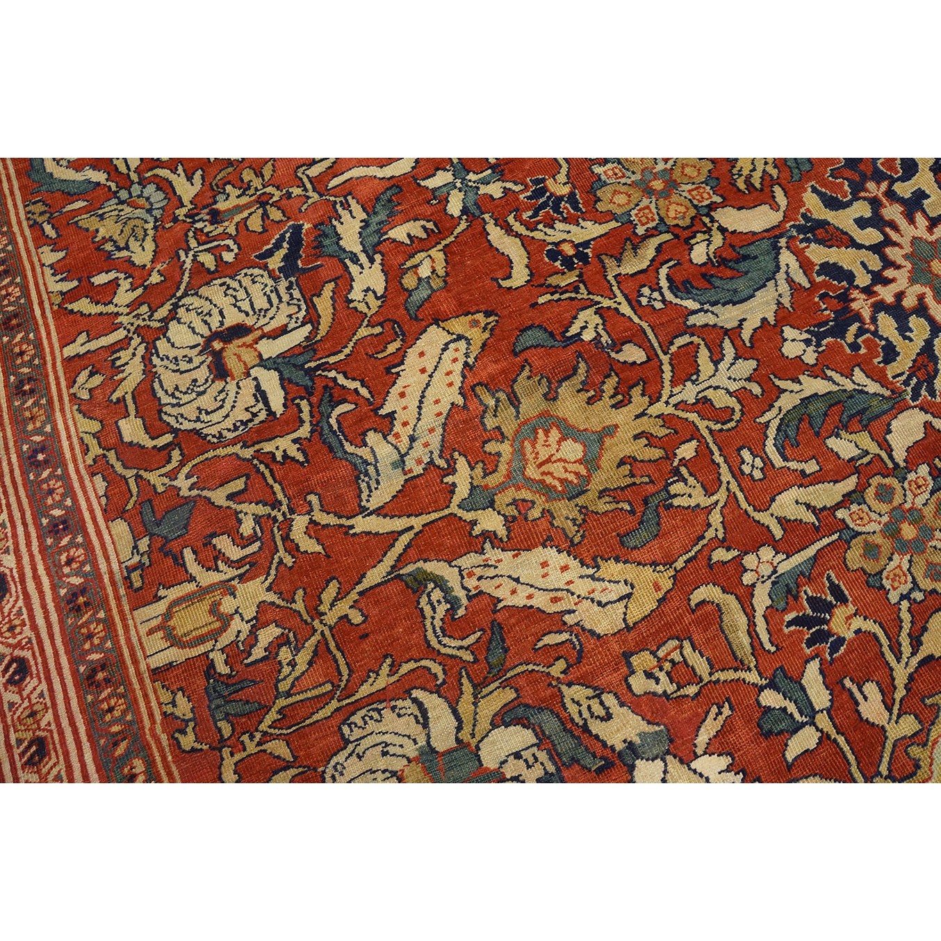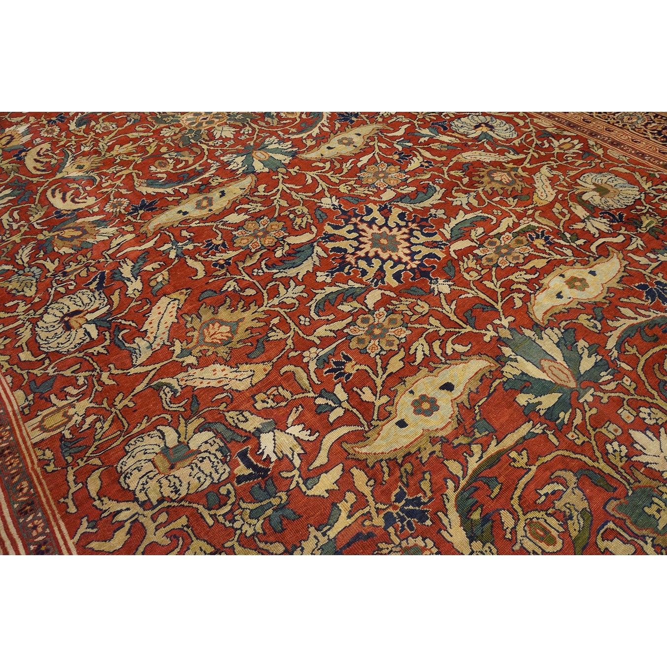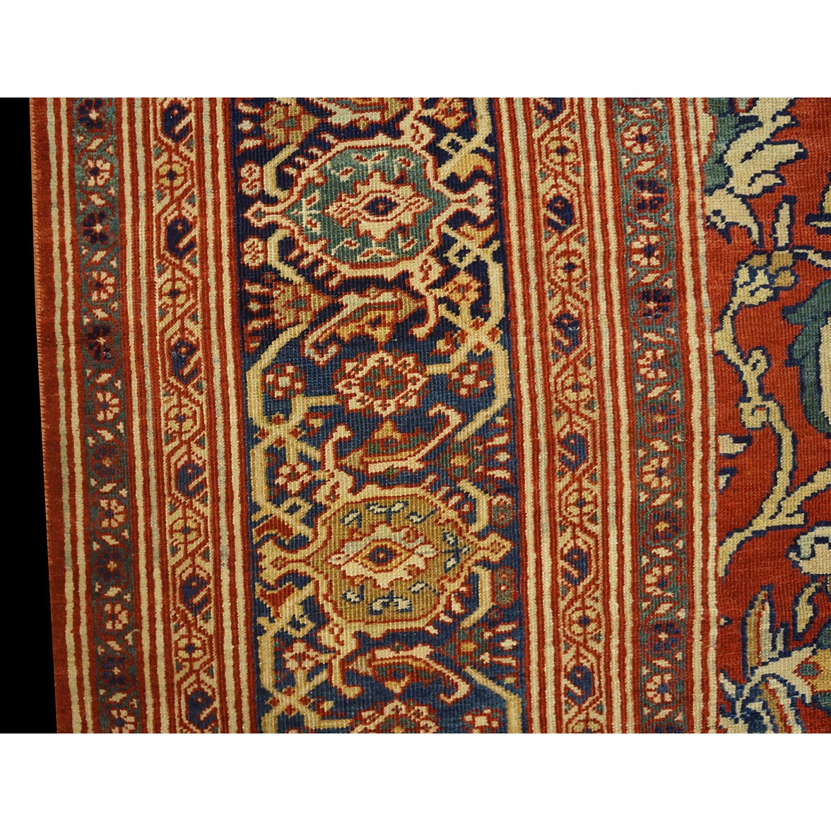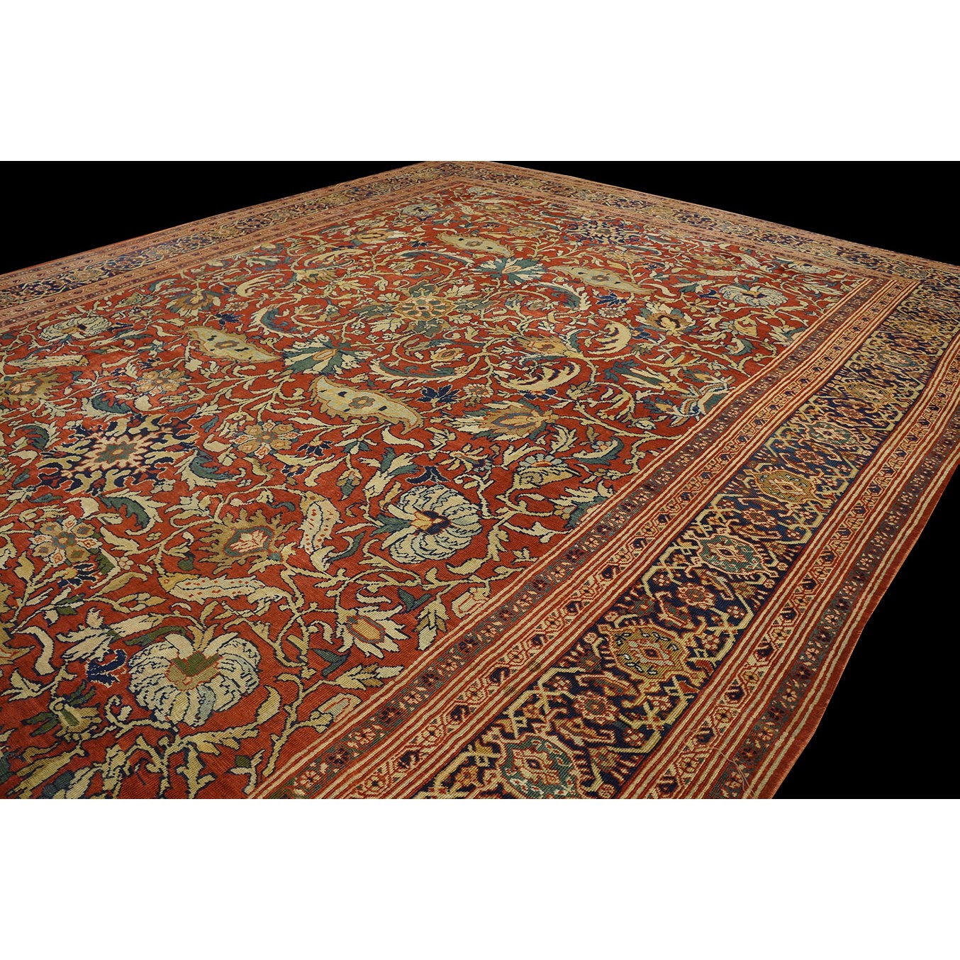 DescriptionSultanabadArak province in western Iran encompasses the town of Sultanabad and various satellite villages, all of which weave for export:the sarouk, Mahal and MushKabad. The latter two grades comprise the sultanabad production. Virtually all are large carpets, up to 16 x 25, with overall, or medallions on decorated or open fields, in soft to bright colors on a cotton foundation, the pile is lowish. The design corpus includes the ever popular Herati, the Harshang palmette motif, rosettes and arabesques, small repeated medallions, etc. The weave varies from coarse to medium. Today, the soft colored pieces with bold patterns are particularly favored. Prices range widely, low for commercial pieces 50 years old, astronomical for light colored Zieglers (see below). | |