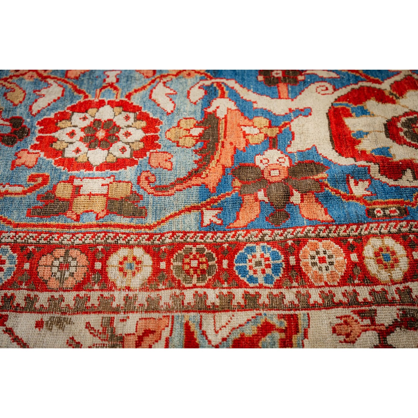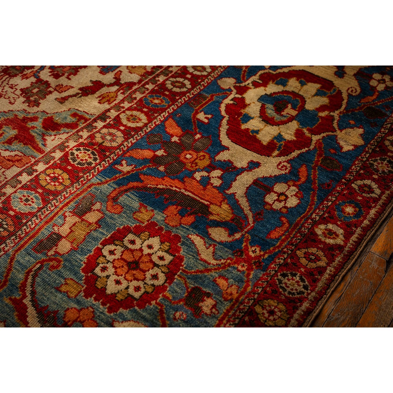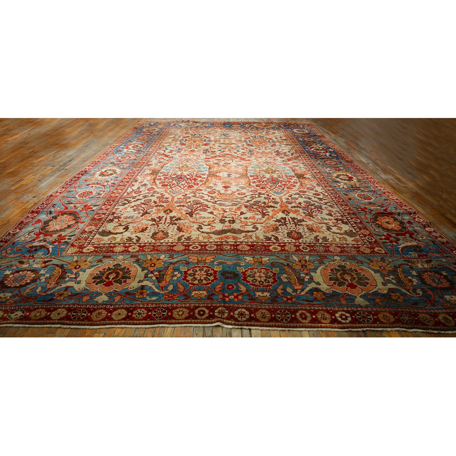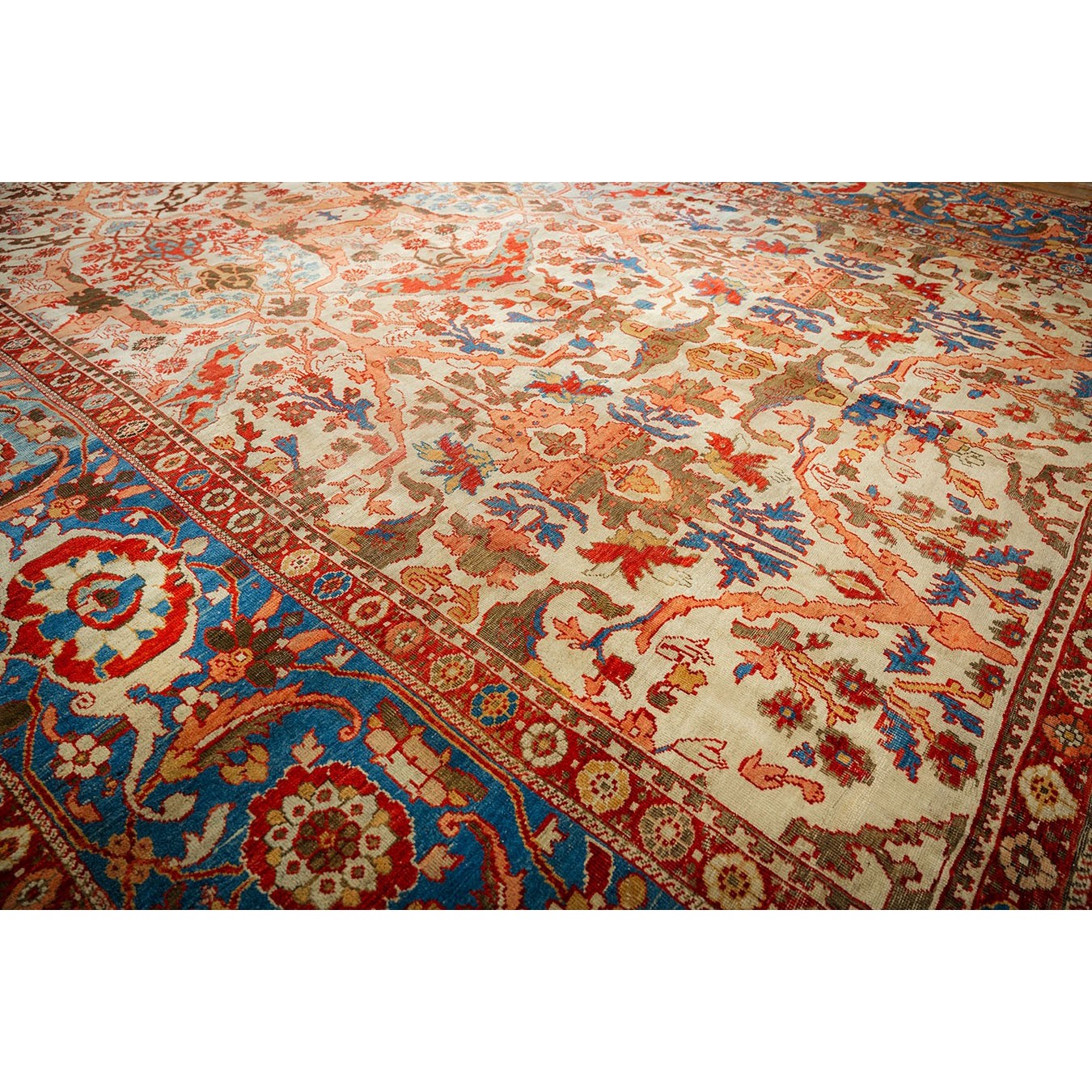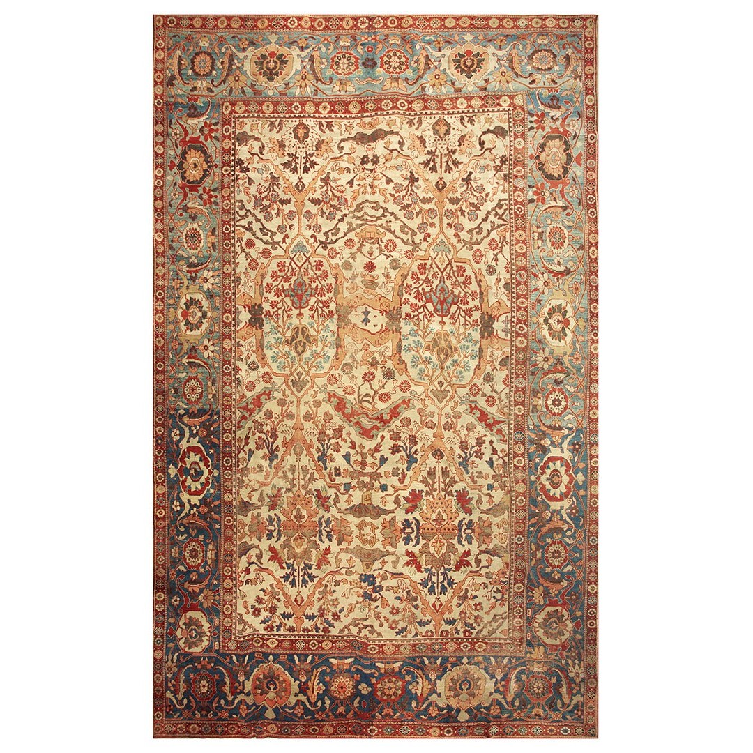 DescriptionSultanabadArak province in western Iran encompasses the town of Sultanabad and various satellite villages, all of which weave for export:the sarouk, Mahal and MushKabad. The latter two grades comprise the sultanabad production. Virtually all are large carpets, up to 16 x 25, with overall, or medallions on decorated or open fields, in soft to bright colors on a cotton foundation, the pile is lowish. The design corpus includes the ever popular Herati, the Harshang palmette motif, rosettes and arabesques, small repeated medallions, etc. The weave varies from coarse to medium. Today, the soft colored pieces with bold patterns are particularly favored. Prices range widely, low for commercial pieces 50 years old, astronomical for light colored Zieglers (see below). | |