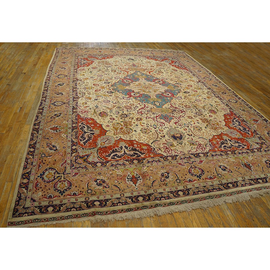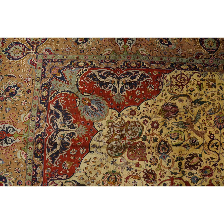 The red corners each show two pairs of addorsed peacocks. The salmon main border exhibits tilted petal palmettes, shields and semi-vases. Pairs if semi-vases make the border corners turn artistically. At each end is a red silk plain-weave with cartouche-shaped pile “islands”. This is a very fine example of the luxurious, money-is-no-object Tabriz carpets which owe more to the painterly arts than to traditional carpet weaving. Although the Tabriz carpet designers are unstudied, the artist here must have been assigned to only the finest and most complex pieces from a shop with extremely high standards. The execution and materials are both impeccable. Good condition.
