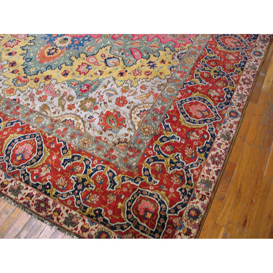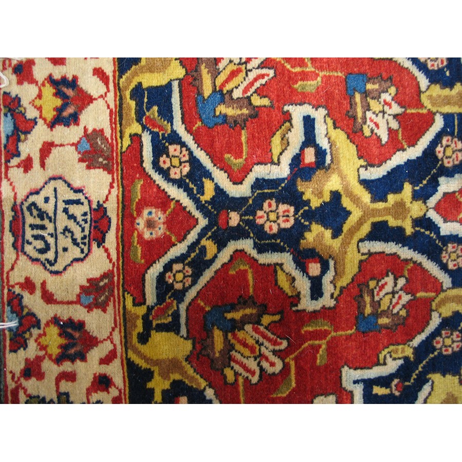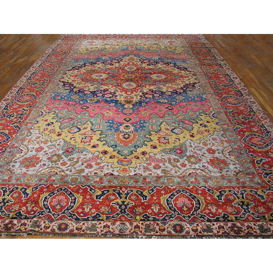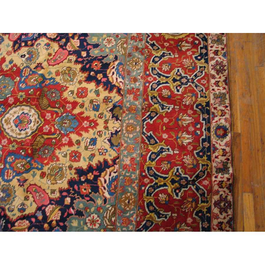 DescriptionTabrizTabriz is the seat of Persian Azerbaijan Province, a large industrial and commercial city with a long history as a past national capital and as an artistic center. The weaving industry was revived there in the 19th century and is carried out in factories where rugs are closely supervised. Quality control is a feature of Tabriz pieces and various grades up to very fine, extremely large carpets may be had. When the colors have mellowed and condition is good, they are extremely valuable and popular with decorators every where. Medallion and overall patterns are woven equally successfully. Silk carpets were popular from this area before 1930 and a few are still made. Sizes range from 2 x 3 to ones 20 x 30. Prices are moderate for the lower grades and upwards. | |