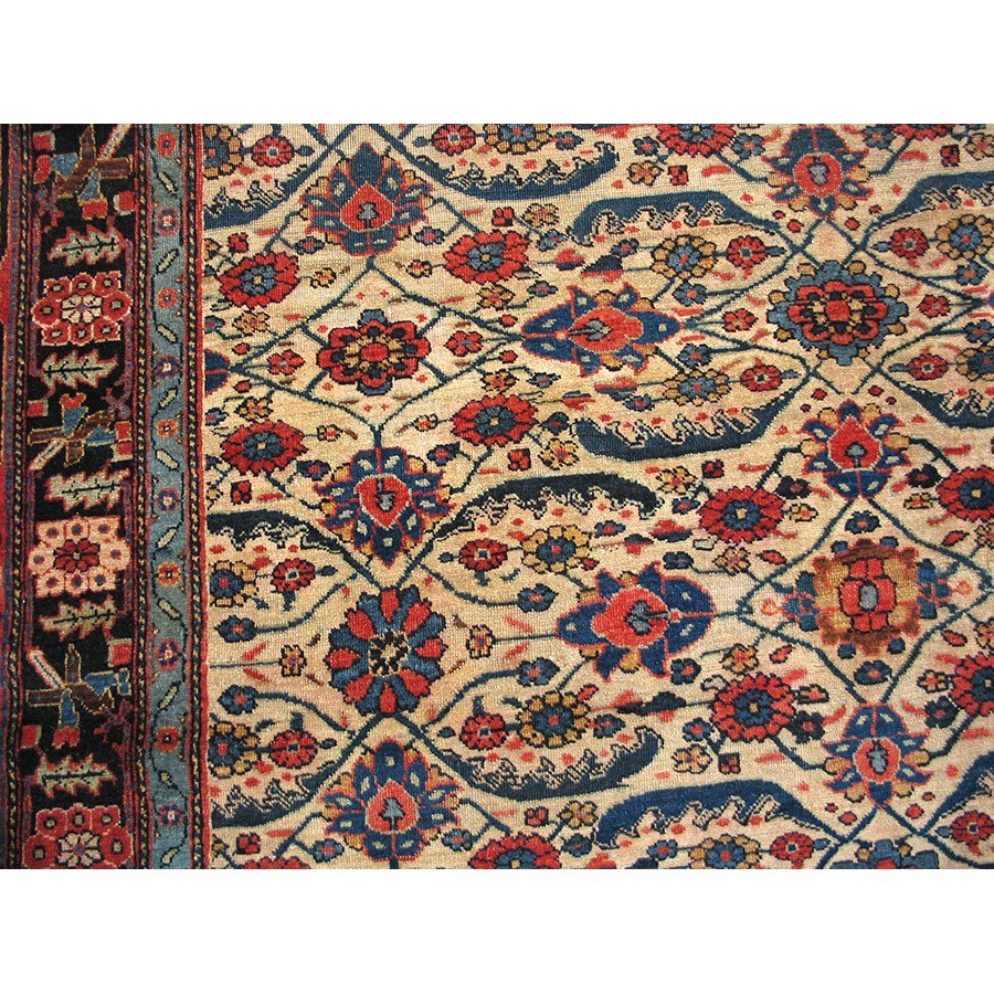 DescriptionTabrizTabriz is the seat of Persian Azerbaijan Province, a large industrial and commercial city with a long history as a past national capital and as an artistic center. The weaving industry was revived there in the 19th century and is carried out in factories where rugs are closely supervised. Quality control is a feature of Tabriz pieces and various grades up to very fine, extremely large carpets may be had. When the colors have mellowed and condition is good, they are extremely valuable and popular with decorators every where. Medallion and overall patterns are woven equally successfully. Silk carpets were popular from this area before 1930 and a few are still made. Sizes range from 2 x 3 to ones 20 x 30. Prices are moderate for the lower grades and upwards. | |
