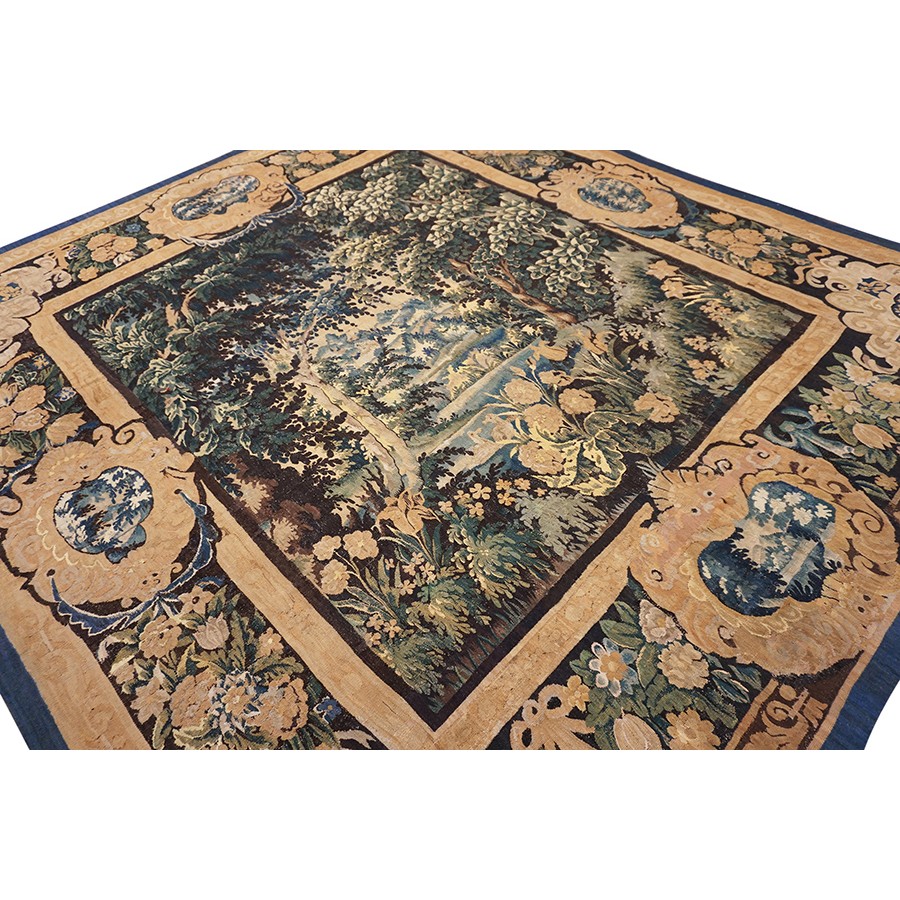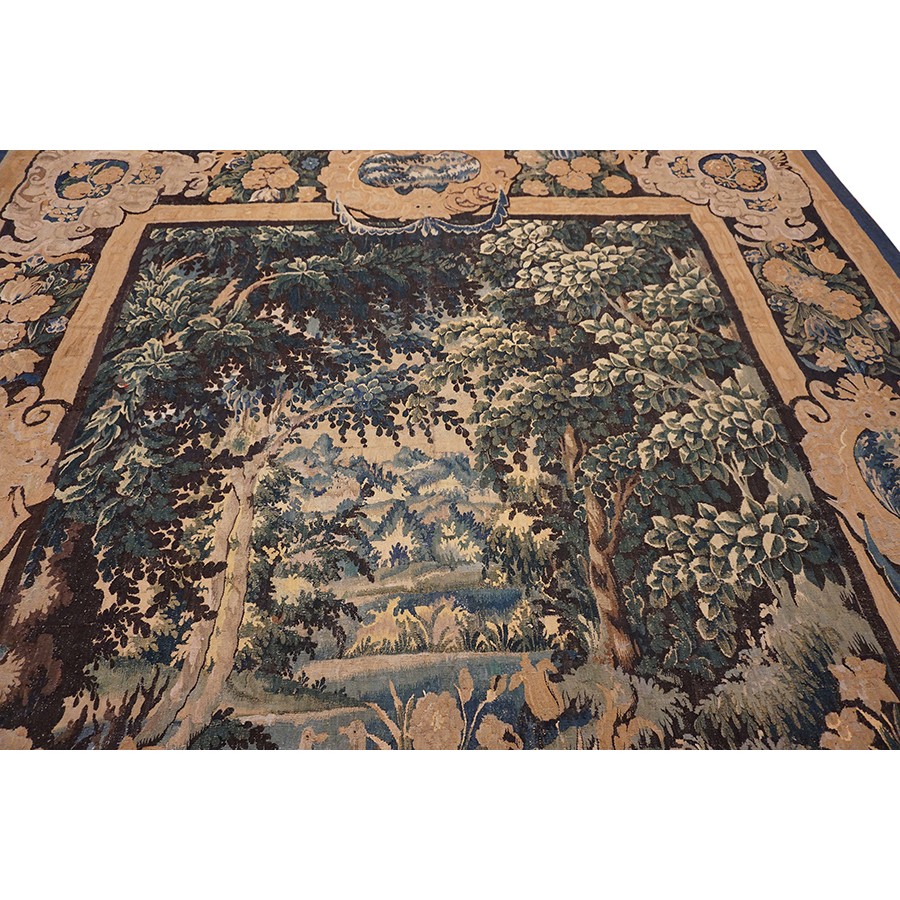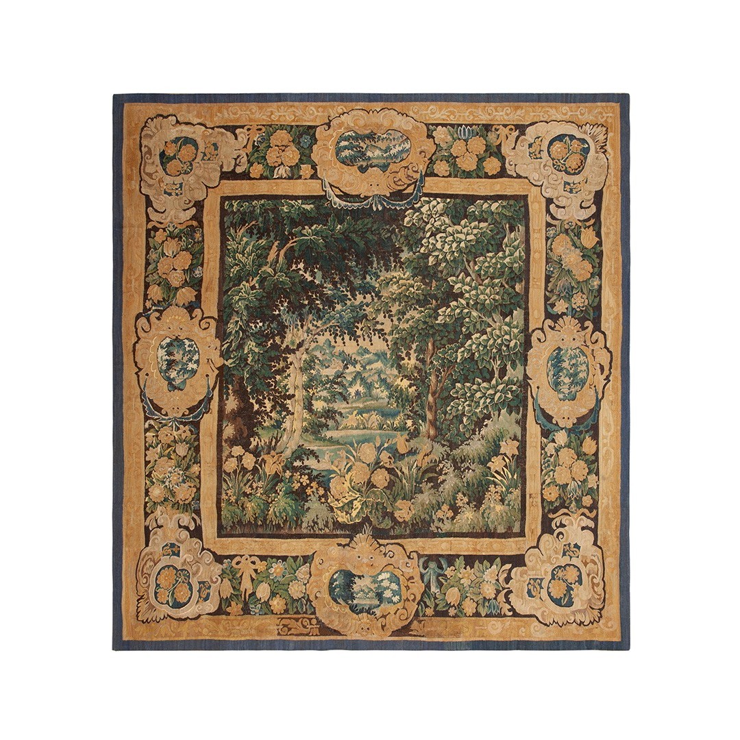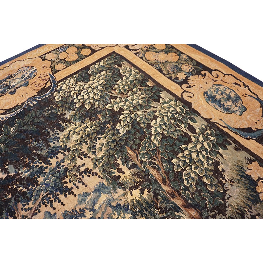 Verdures were popular in sizes ranging from two by three meters up to more than three by more than five meters throughout the 18th century, either is suites or as singletons. Our example is a pure forest and landscape vista type with no birds, animals, human habitations or figures.