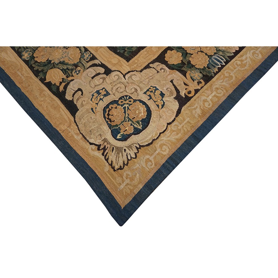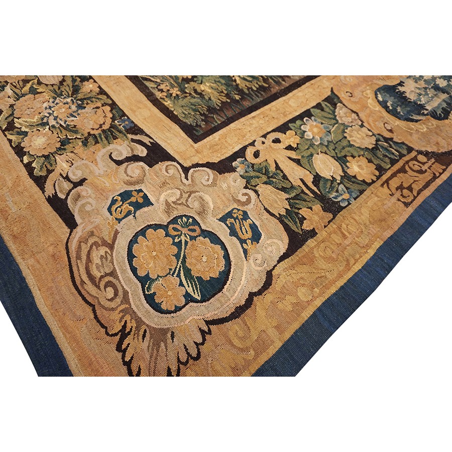 This is a classic example of the verdure genre popular in 18th century Europe and woven in both France and Flanders. In the placid summer landscape, fully foliaged trees press in from each side to frame a deep vista of a meandering stream and rolling hills. Although the trees are generally generic, the large, gnarled one at the left may be intended to be an oak .The tree on the right could be a laurel. The foreground flowers are centred by a yellow blossomed plant with artichoke-style leaves. This is not a rose although the flowers bear a general resemblance. And the leaves do not resemble rose leaves. An equally yellow tulip grows to the right lower right corner next to what might be intended as a daisy. The wide border displays scroll-edged and an iris (?) sprouts in the three dimensional cartouches (escutcheons), some with textile swags, in the corners and at the midpoints of all four sides. Four escutcheons have grotesque masks as further ornaments. These cartouches show either micro-verdure landscapes or daisy/rose flowers repeating those in the field. These illusionistic cartouches are less common than those displaying armorials. The rose/ daisy motif recurs yet again in the border sections between the escutcheons along with other garden flowers. A French Herbal would allow one to exactly identify the various plants. Bows and ribbons are mixed in with the floral bouquets.